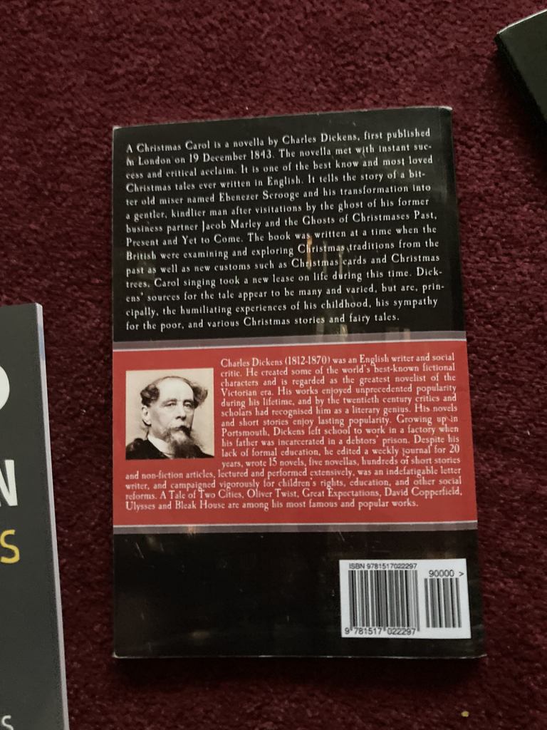A Christmas Carol is a novella by Charles Dickens, first published in London on 19 December 1843. The novella met with instant success and critical acclaim. It is one of the best know and most loved Christmas tales ever written in English. It tells the story of a bitter old miser named Ebenezer Scrooge and his transformation into a gentler, kindlier man after visitations by the ghost of his former business partner Jacob Marley and the Ghosts of Christmases Past, Present and Yet to Come. The book was written at a time when the British were examining and exploring Christmas traditions from the past as well as new customs such as Christmas cards and Christmas trees. Carol singing took a new lease on life during this time. Dickens' sources for the tale appear to be many and varied, but are, principally, the humiliating experiences of his childhood, his sympathy for the poor, and various Christmas stories and fairy tales.