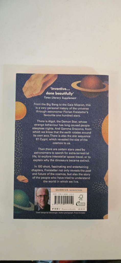 New, duplicated gift. From other copy I have read, this is a fascinating read. "A History of the Universe in 100 Stars" by Florian Freistetter is a paperback book published by Quercus Publishing in 2022. Translated by Gesche Ipsen, this book offers a comprehensive exploration of the natural history of the universe through the lens of astronomy. With a focus on the beauty and complexity of the cosmos, this 336-page book is written in English and provides readers with a deeper understanding of the stars and their significance in shaping our universe. Perfect for those interested in delving into the mysteries of the universe, this book is a captivating journey through the wonders of the cosmos.