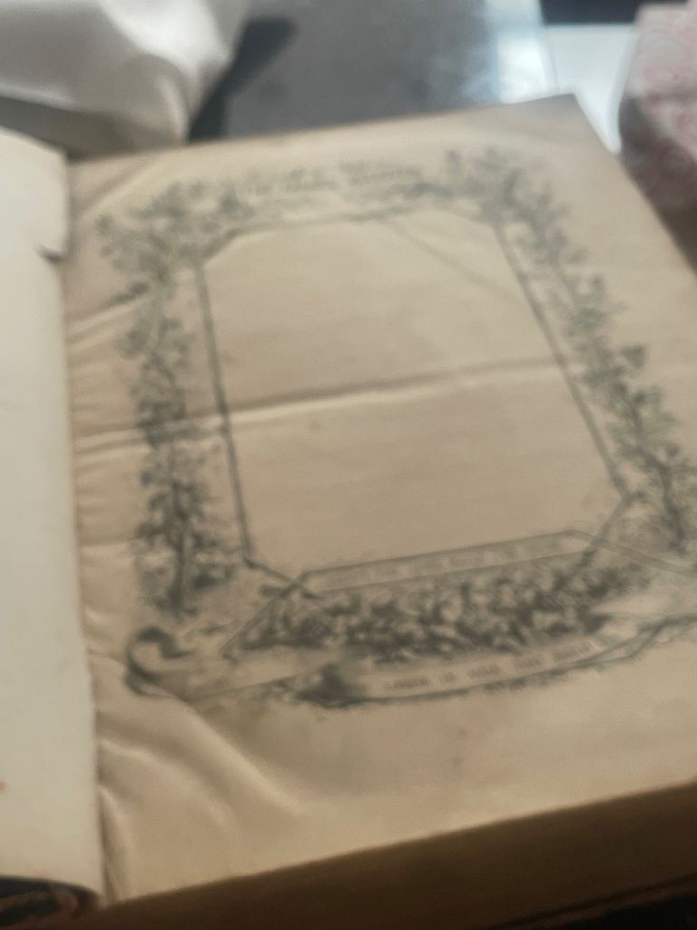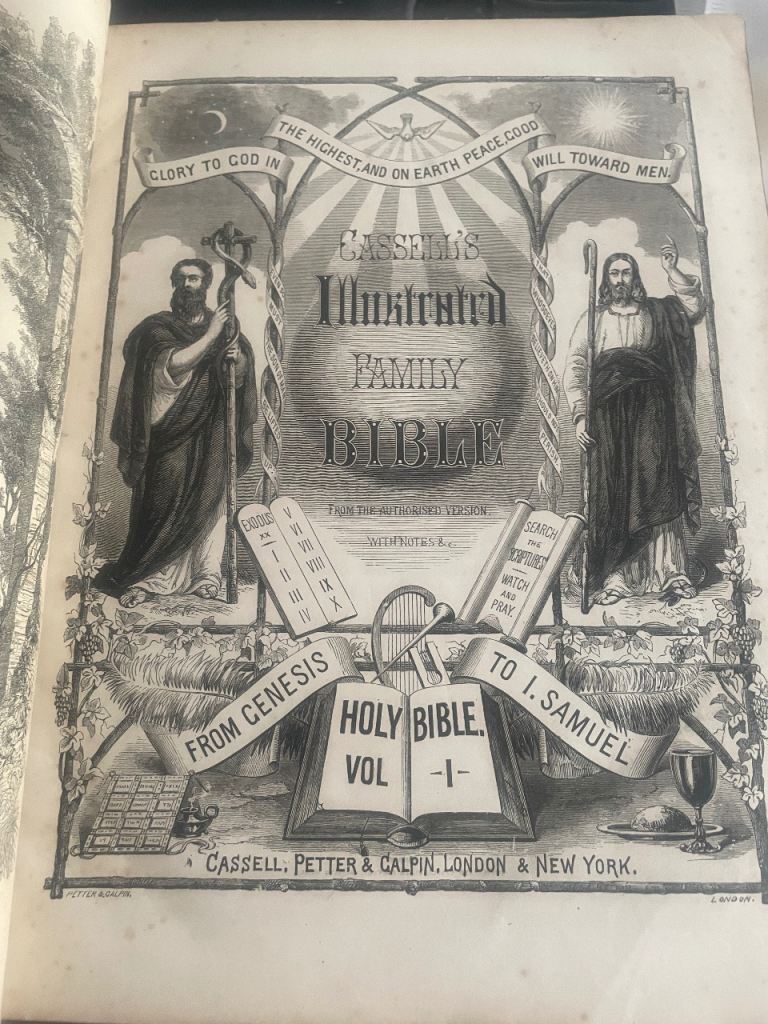 A huge antique bible with lots of detailed illustrations. Heavy leather bound gold leaf edged pages.