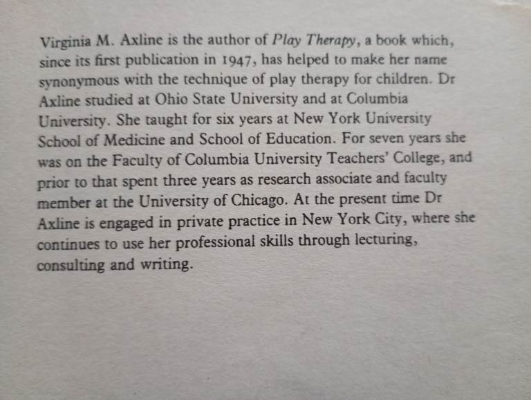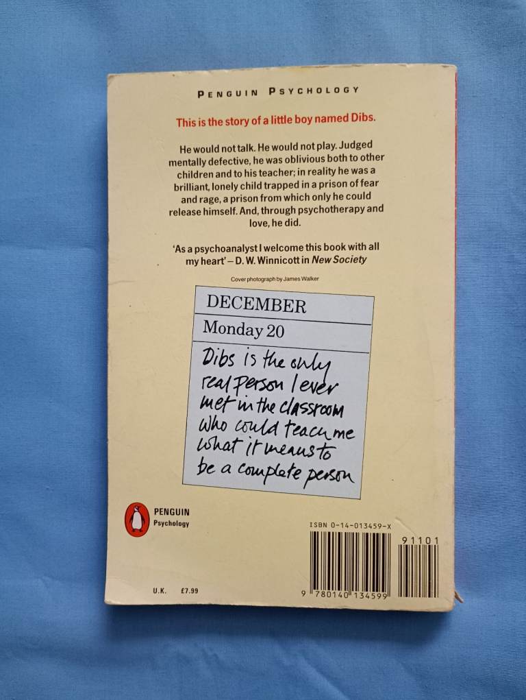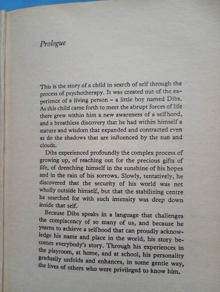 A heart-wrenching true story which chronicles a year of play therapy sessions with a little boy names Dibs which eventually helped to release him from his feelings of loneliness, fear and rage which were engulfing him. Eventually, as detailed in the prologue of this book (printed above) this loving, enchanting little person emerges with a positive sense of self-hood achieved through the patience, experience and understanding of his therapist. As Ms. Axline engages and gains a rapport with Dibs through the play therapy, 'his personality gradually unfolds, and enhances the lives of others who were priveleged to know him'. My wife personally came across this book, as well as some others, when she started her career as a teaching assistant in 1999, working with children with special needs in mainstream education. She says - 'Dibs' story never left me - I just wanted to hug this little boy, and as I immersed myself in his story, which often brought a tear to my eye, his intellect and character started to shine through and the ending of the story brings such joy and is inspirational.' We own two copies of this book, the first is currently on loan to a friend.
