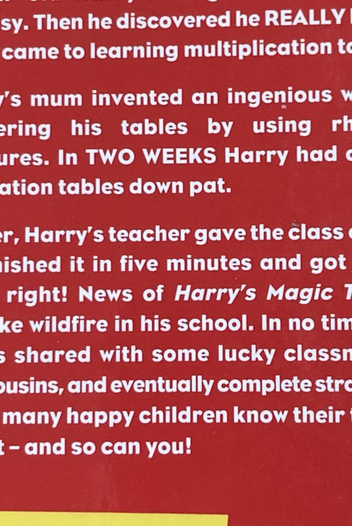 Nine year old Harry Moraghan never found maths easy. Then he discovered he REALLY hated it when it came to learning multiplication tables. So Harry s mum invented an ingenious way of remembering his tables by using rhymes and pictures. In TWO WEEKS Harry had all his multiplication tables down pat.