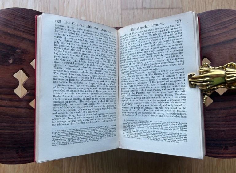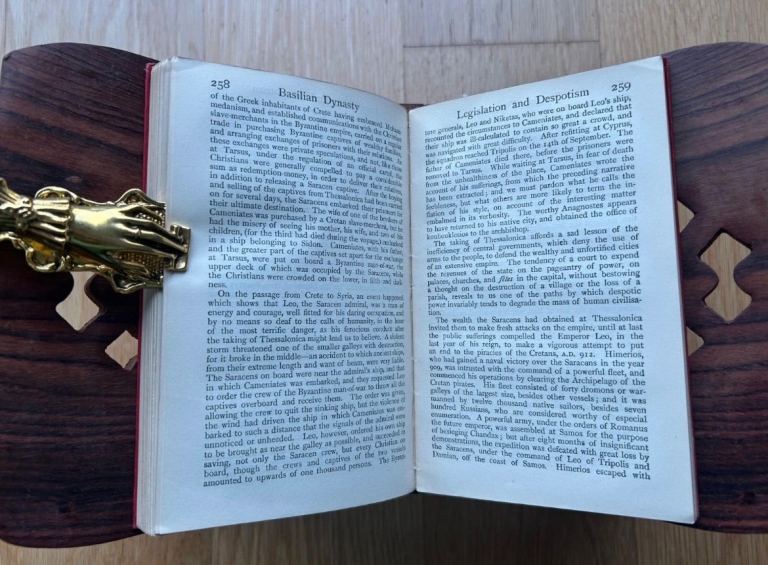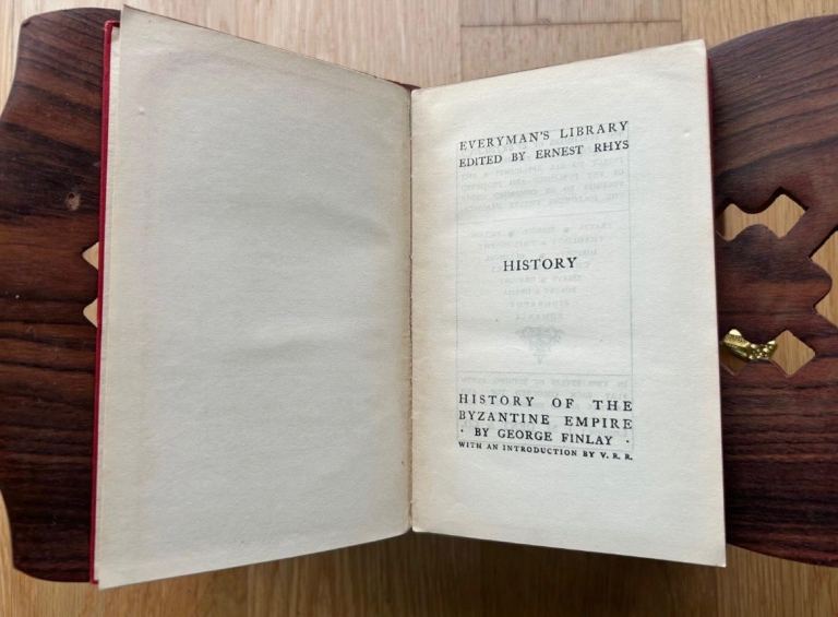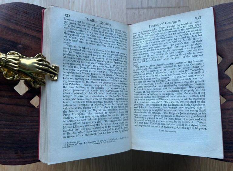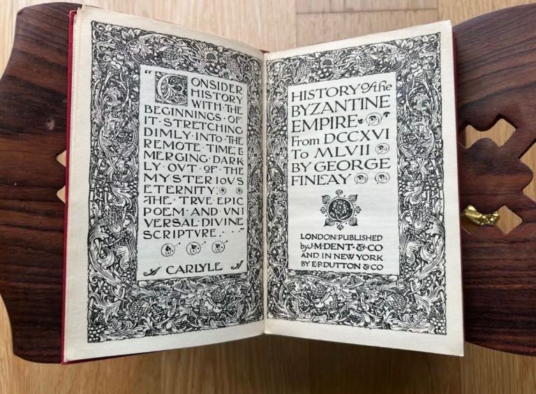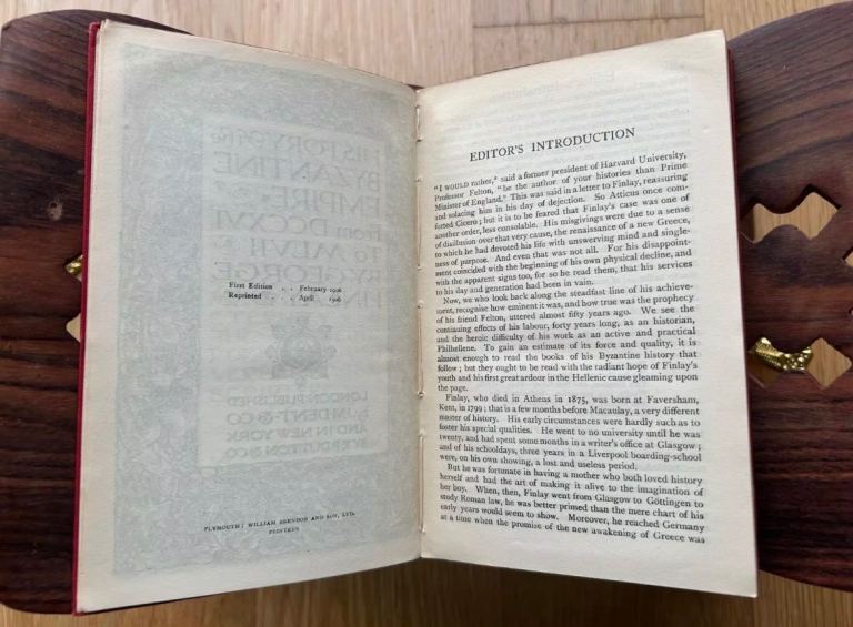 George Finlay's History of the Byzantine Empire from DCCXVI to MLVII chronicles the rise, transformation, and decline of one of history's most enduring empires. Spanning from 716 to 1057 AD, this meticulously detailed account delves into the Byzantine Empire's political intrigues, cultural brilliance, and resilience amidst external threats from Arabs, Bulgarians, and Western powers. Finlay masterfully highlights the empire's pivotal role as a guardian of ancient knowledge and a bridge between East and West. This sweeping narrative captures the human drama of emperors, generals, and ordinary citizens shaping a civilization that influenced the medieval world and beyond. Crimson covers adorned with an embossed logo on the front, featuring intricate titles and rose motifs along the spine. Inside, a beautifully designed double title page adds a touch of elegance and sophistication to the presentation. Clean pages without any damage. Inscription says 'G. Boyce Allen'.