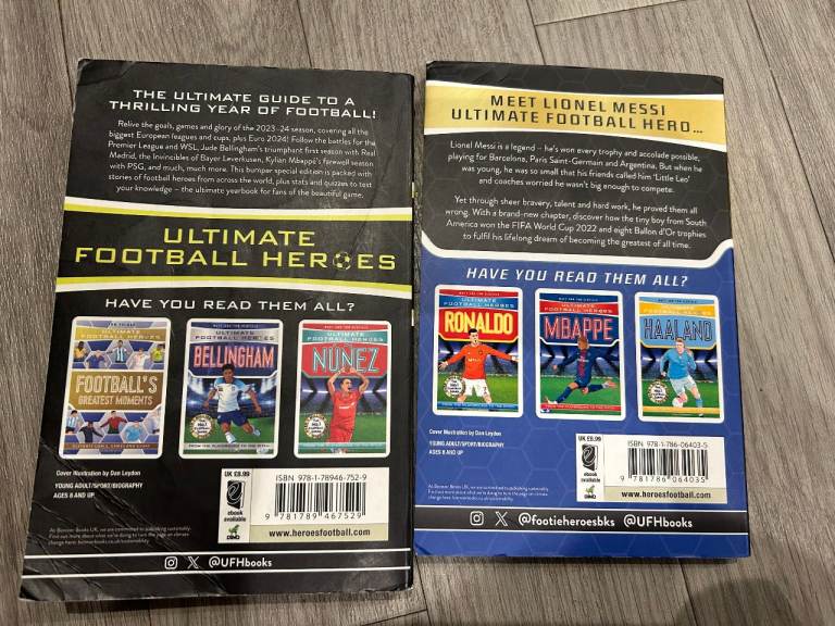 Books are in good condition. The back cover of Ultimate Football Heroes book is bent which is visible on pictures.