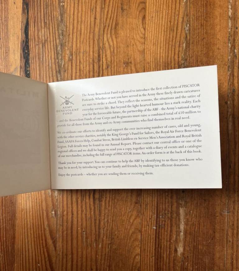 Military Manoeuvres A Book of Piscator Postcards (not complete, contains 16 cards) published in 2000 by Good Books (GB Publications Ltd) for the Army Benevolent Fund