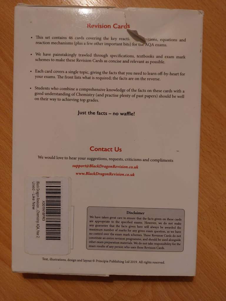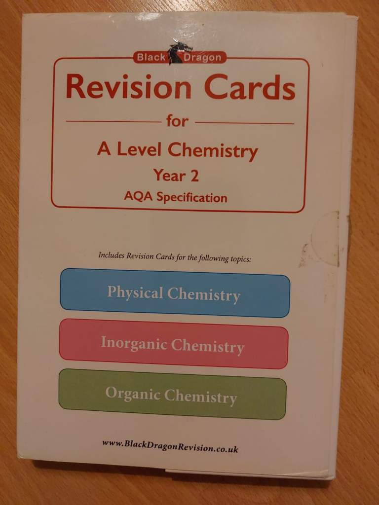 Black Dragon Revision Cards for A Level Chemistry, Year2 for AQA specification. Includes revision cards for Physical Chemistry, Inorganic Chemistry and Organic Chemistry.