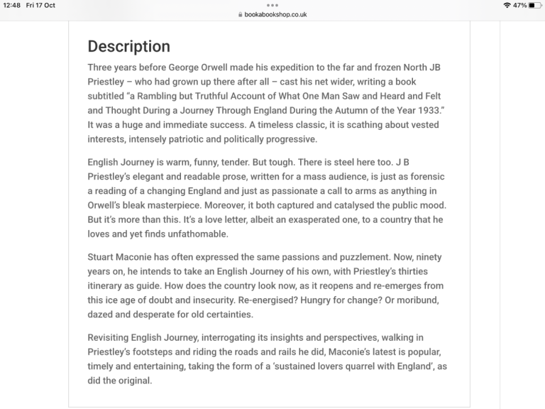 Revisiting English Journey, interrogating its insights and perspectives, walking in Priestley’s footsteps and riding the roads and rails he did, Maconie’s latest is popular, timely and entertaining, taking the form of a ‘sustained lovers quarrel with England’, as did the original.