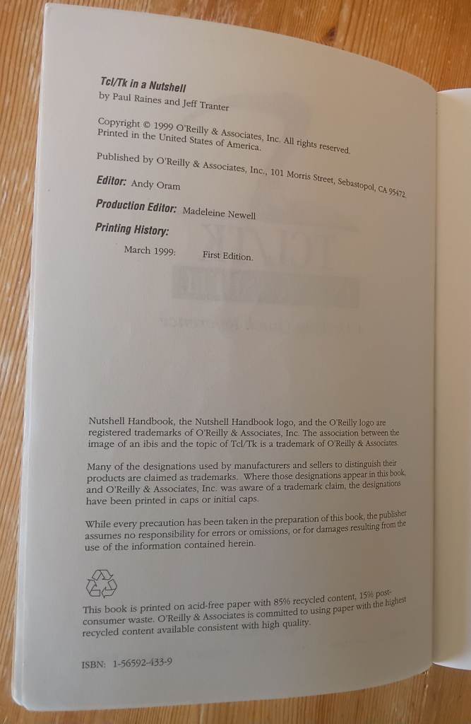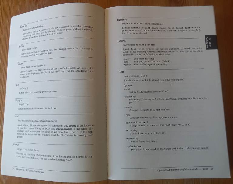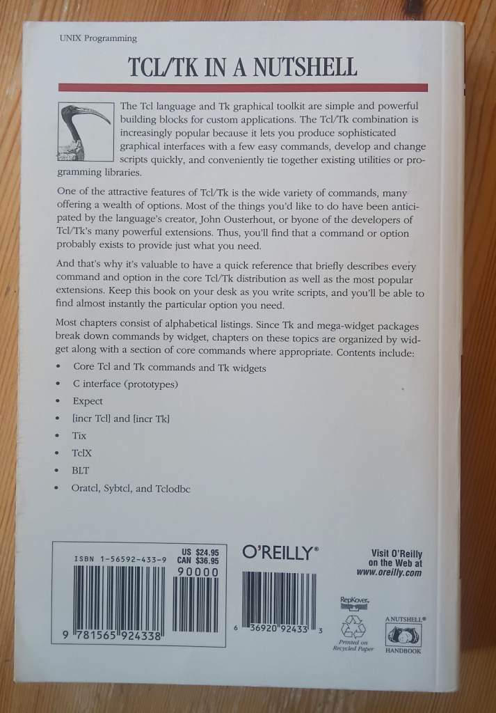 A book that provides a quick reference that briefly describes every command in the core Tcl/Tk distribution as well as the most popular extensions. It has been well used and there are thumb marks on the edges of the pages, it looks like the spine is bent on one particular page (obviously a well used page), please see the photos. Collect from Westbury on Trym, Bristol BS9.