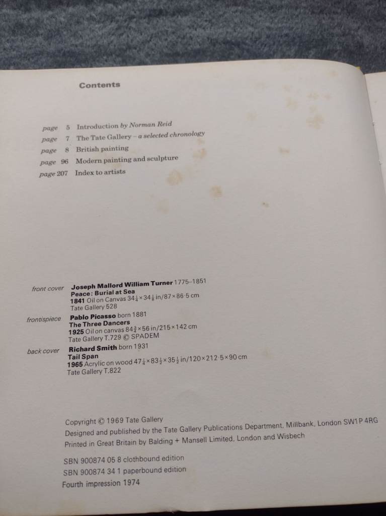 This is a 1974 Tate Gallery Publications fourth impression of a book first published in 1969. This book is in a fair condition with its dustcover. It has age marks and there are redacted personal details on the back of the front cover. There are photographs showing this. It weighs 837g and measures 22cm x 22cm x 2.5cm. Collection or delivery.