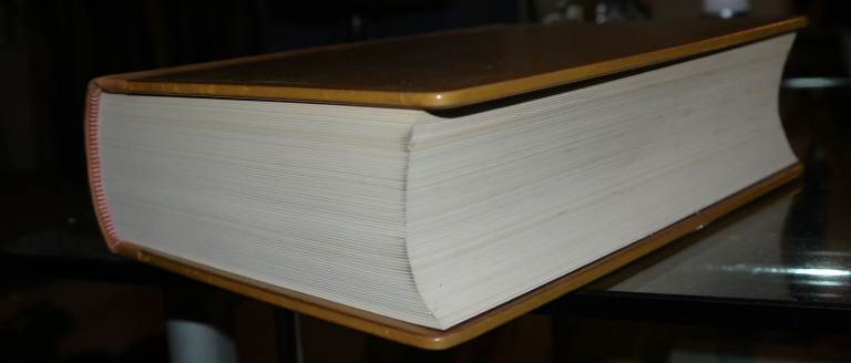 Unusually, the book boards are both made from wood with a Leather-bound spine with Gilt Engravings