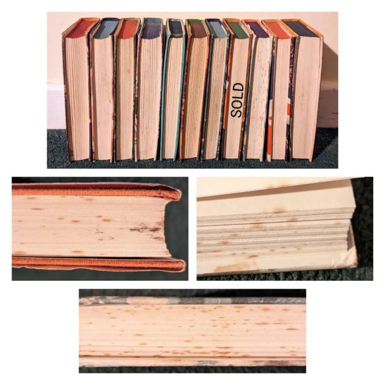 Some jacket wear/marks/small tears in places. Several page edges & the first/last few pages sometimes have marks/discoloration from poor storage in the past (occasionally a few spots further in the pages too). A few have initials written inside/the spine. A slight musty book smell to them up close but generally in very good condition - all still readable. Examples of any flaws in the photos but feel free to ask if you'd like to see the condition of specific books.