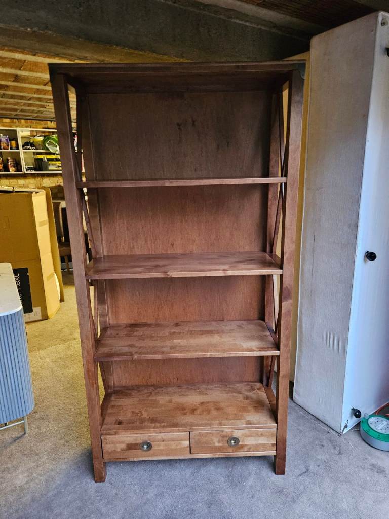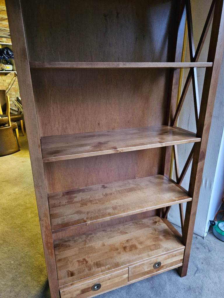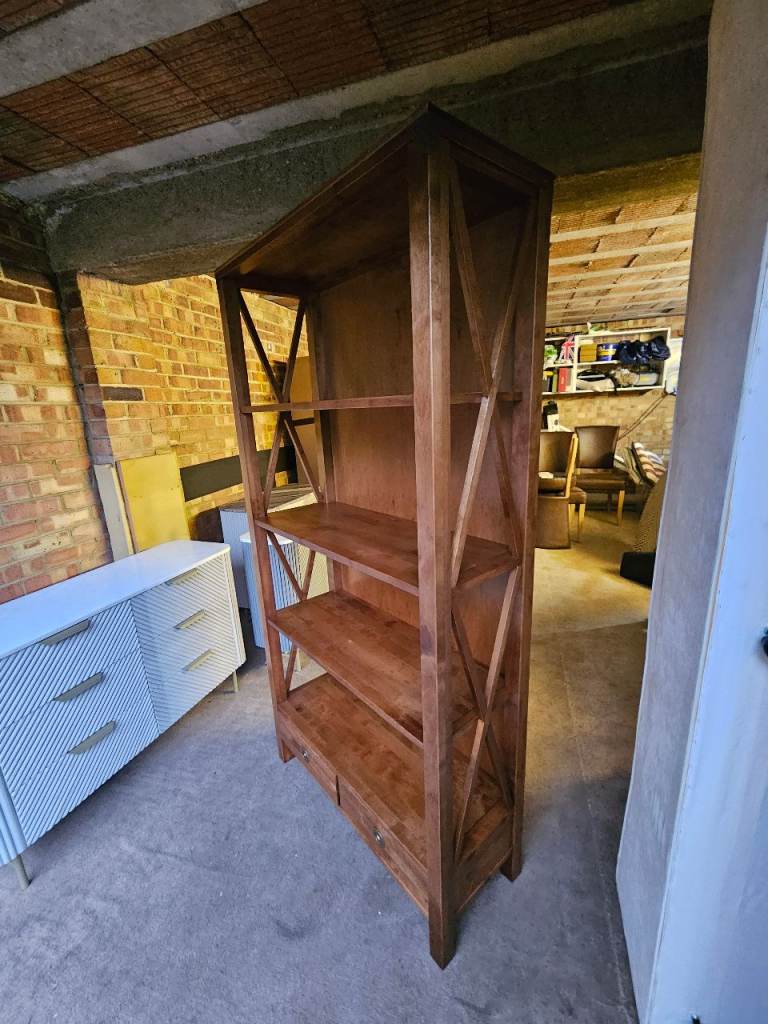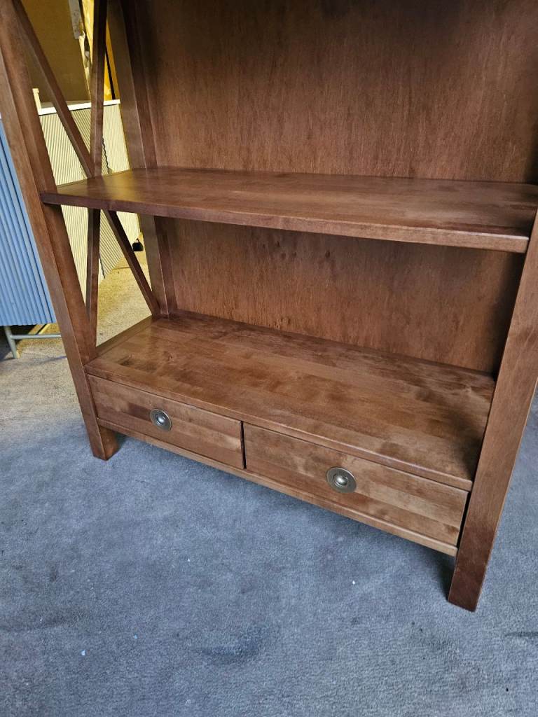 This 2 drawer single bookcase features a distinctive cross design on each side and comprises three fixed shelves and two handy drawers.