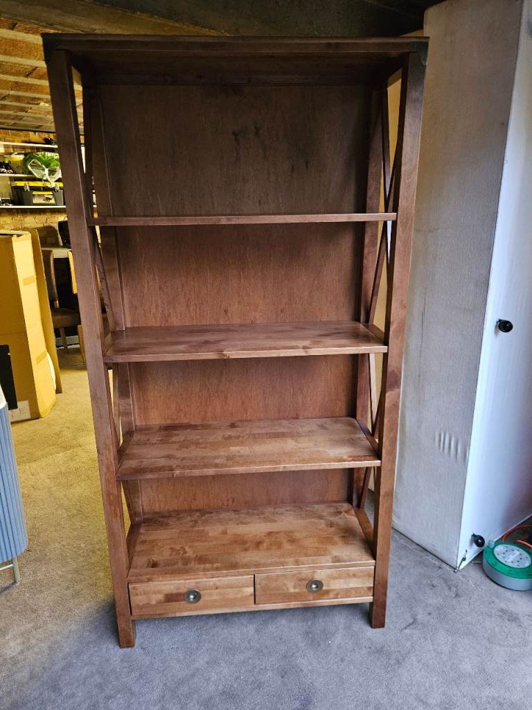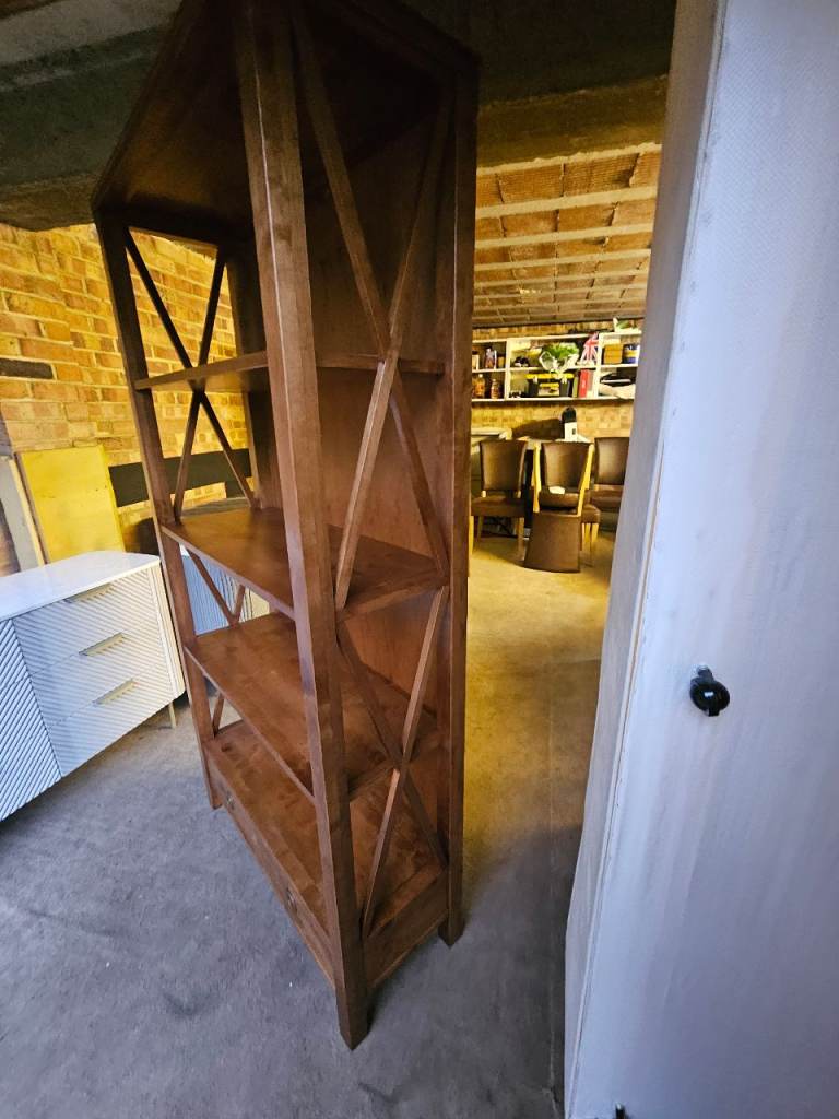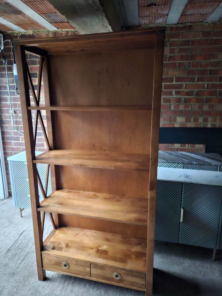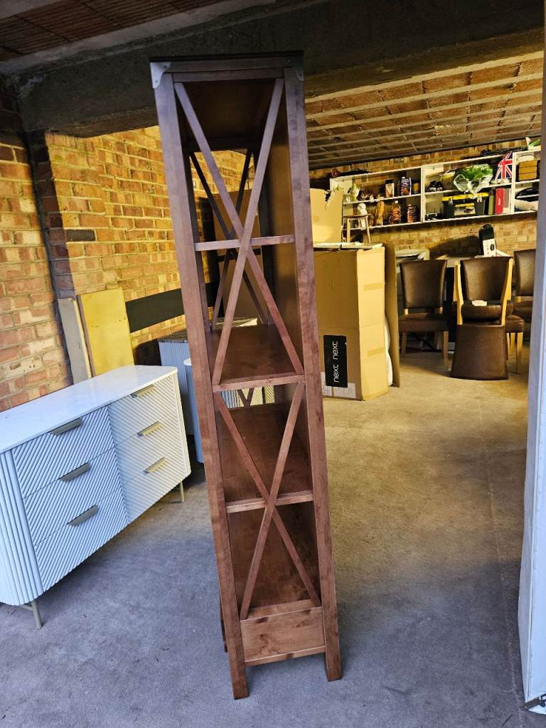 This 2 drawer single bookcase features a distinctive cross design on each side and comprises three fixed shelves and two handy drawers.