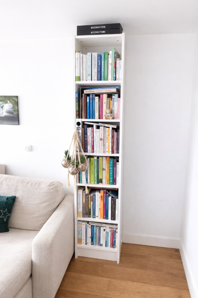 The bookshelf is sturdy and stable, with no cracks, no scratches, and no damage. It stands securely and fits neatly against the wall.