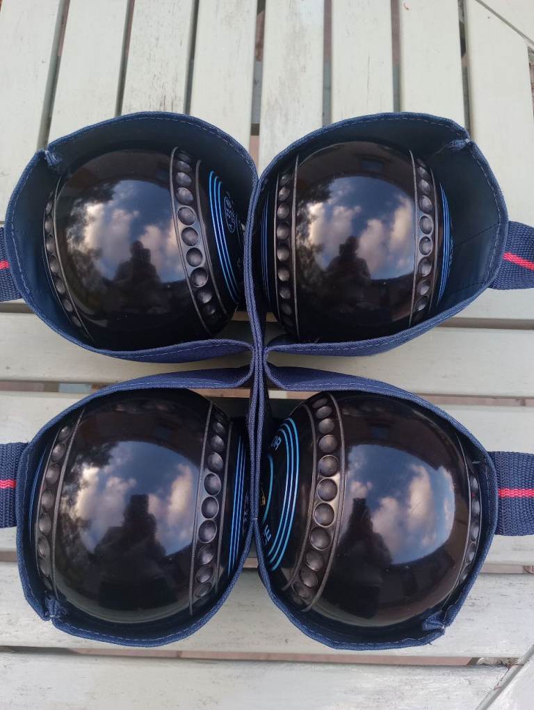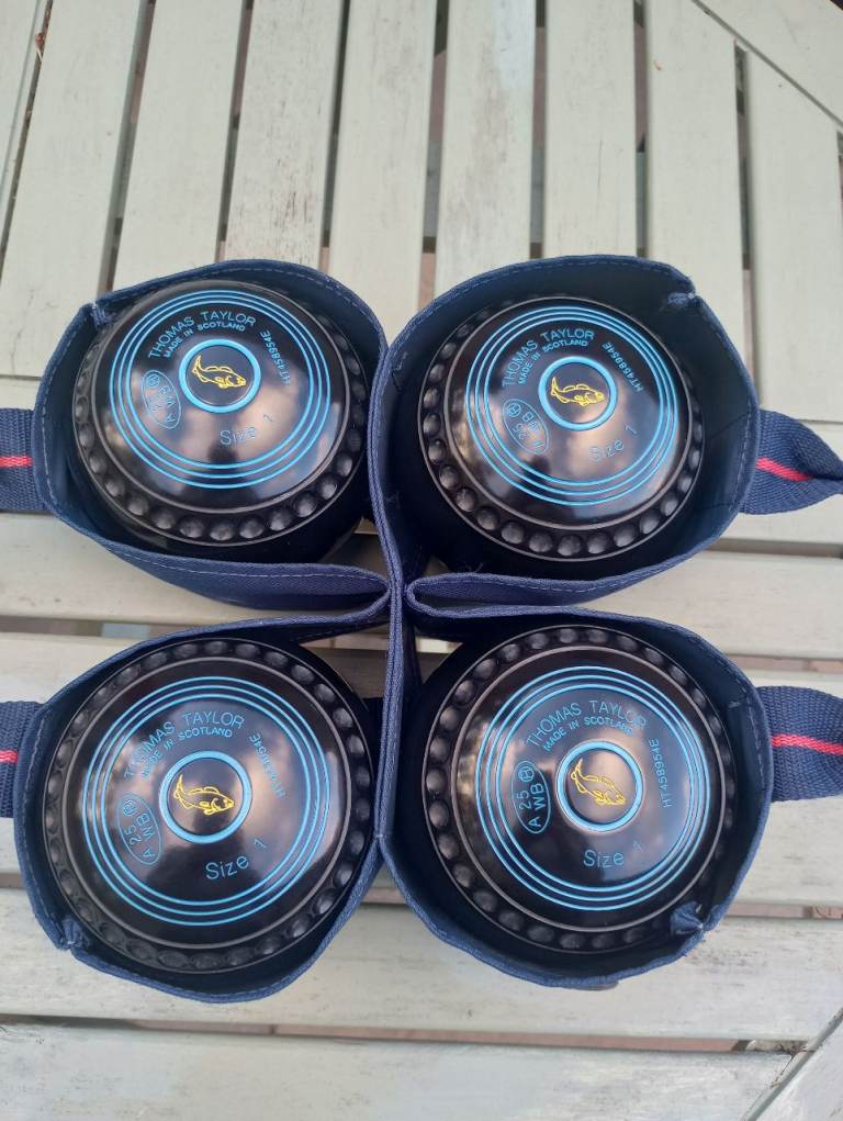 Pending. 4 no Taylor Ace bowls size 1 heavy. Colour black with fish emblem and blue rings. Stamped WB 25. Excellent condition as hardly used. Complete with Henseltie bowls carrier. Pick up from Glenrothes only