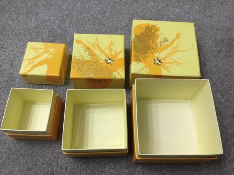 The product is a set of three yellow square cardboard gift boxes from the Floral brand.