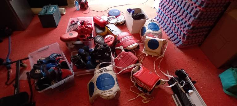 Boxing equipment bundle including punch bag, gloves, pads and headguard.