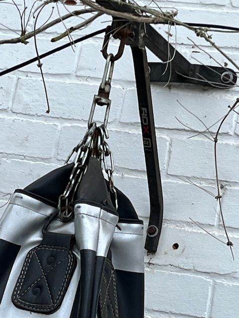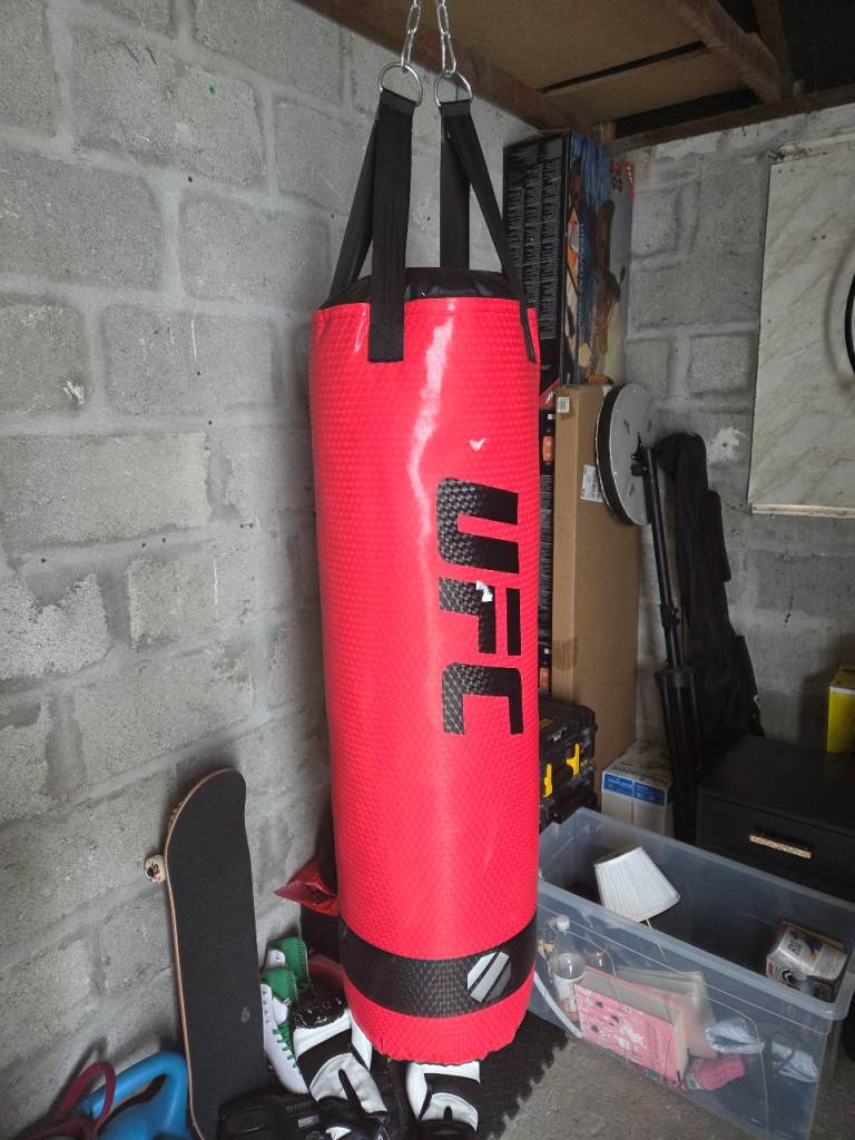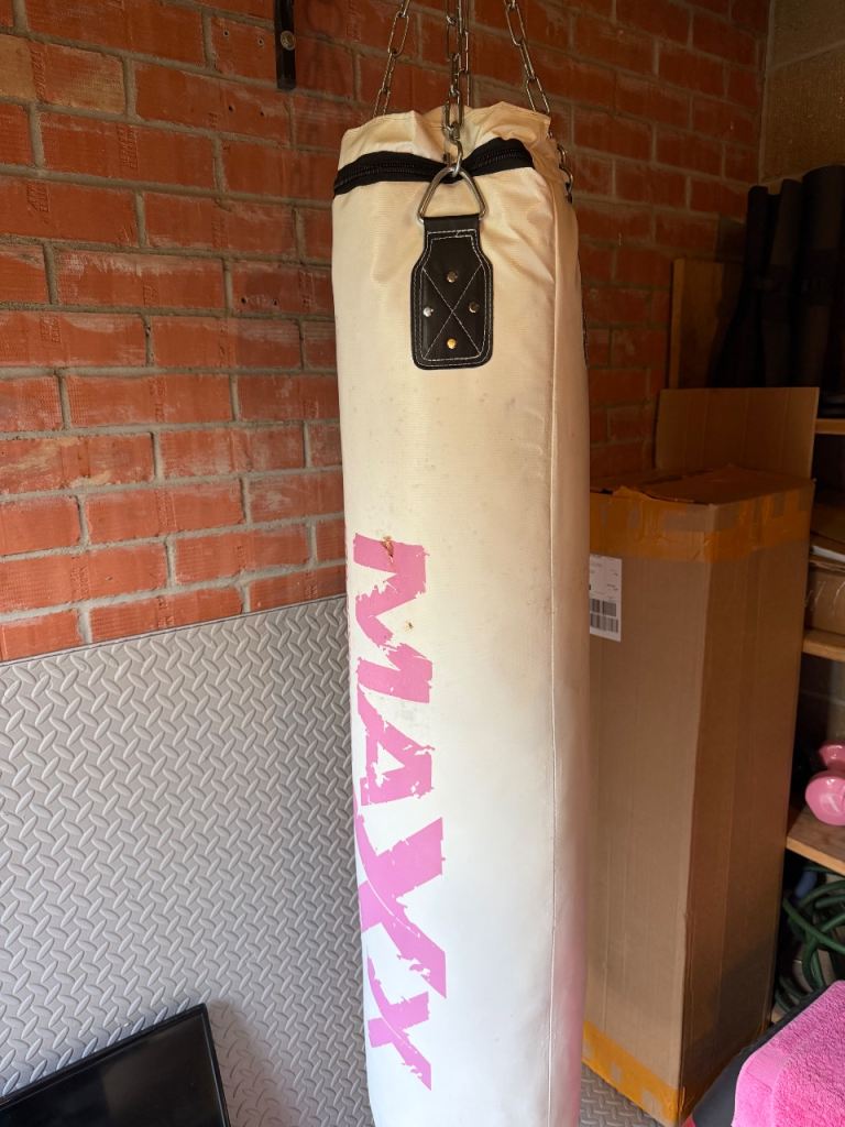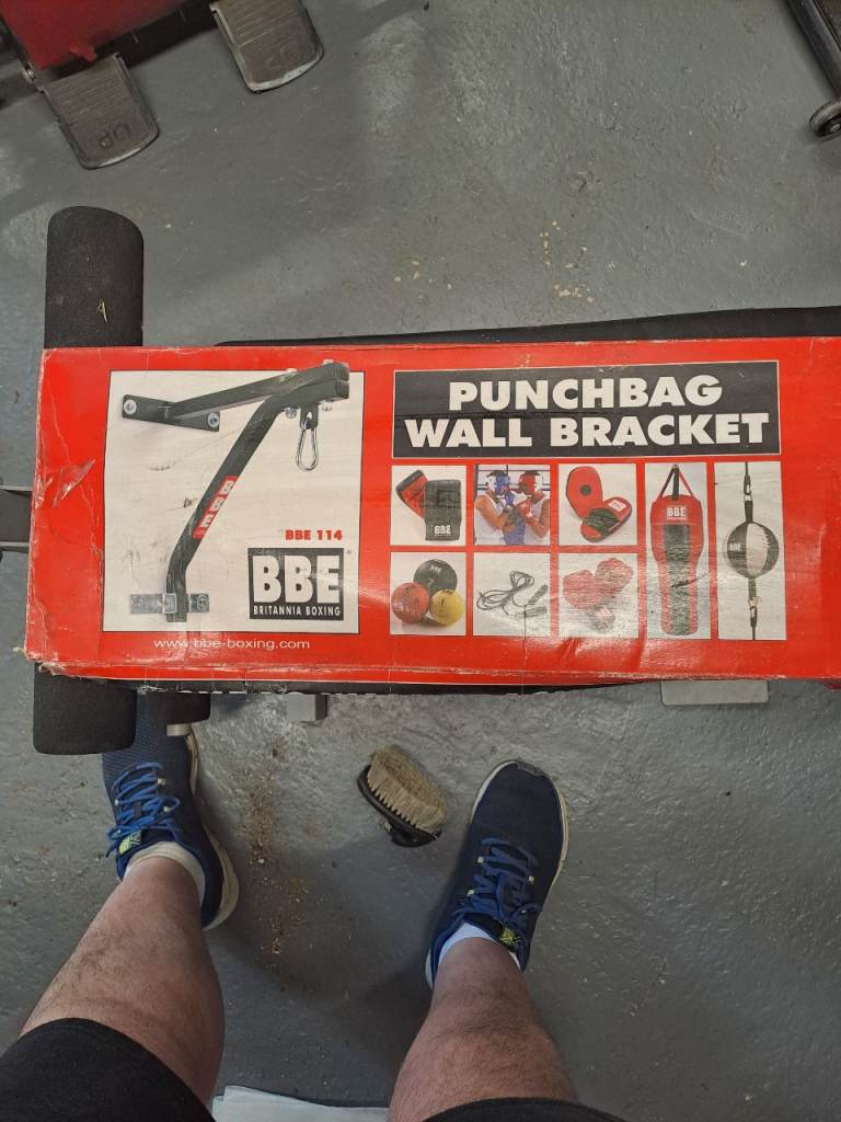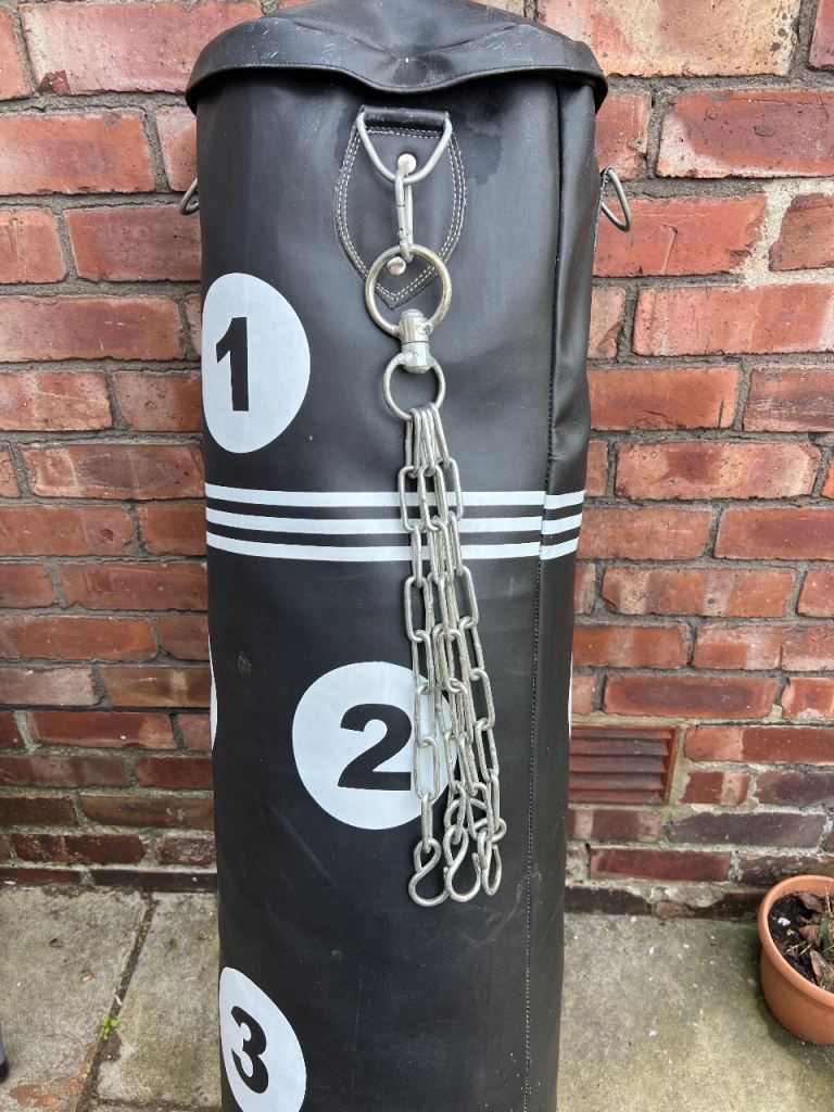 A heavy hanging 5 ft punch bag in reasonable condition with chain. bracket and cover. Some cosmetic wear and tear does not affest use of the item in any way. Collection only. Brackets just requires unbolting from the wall.