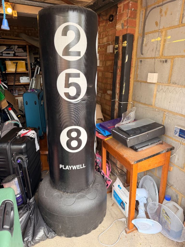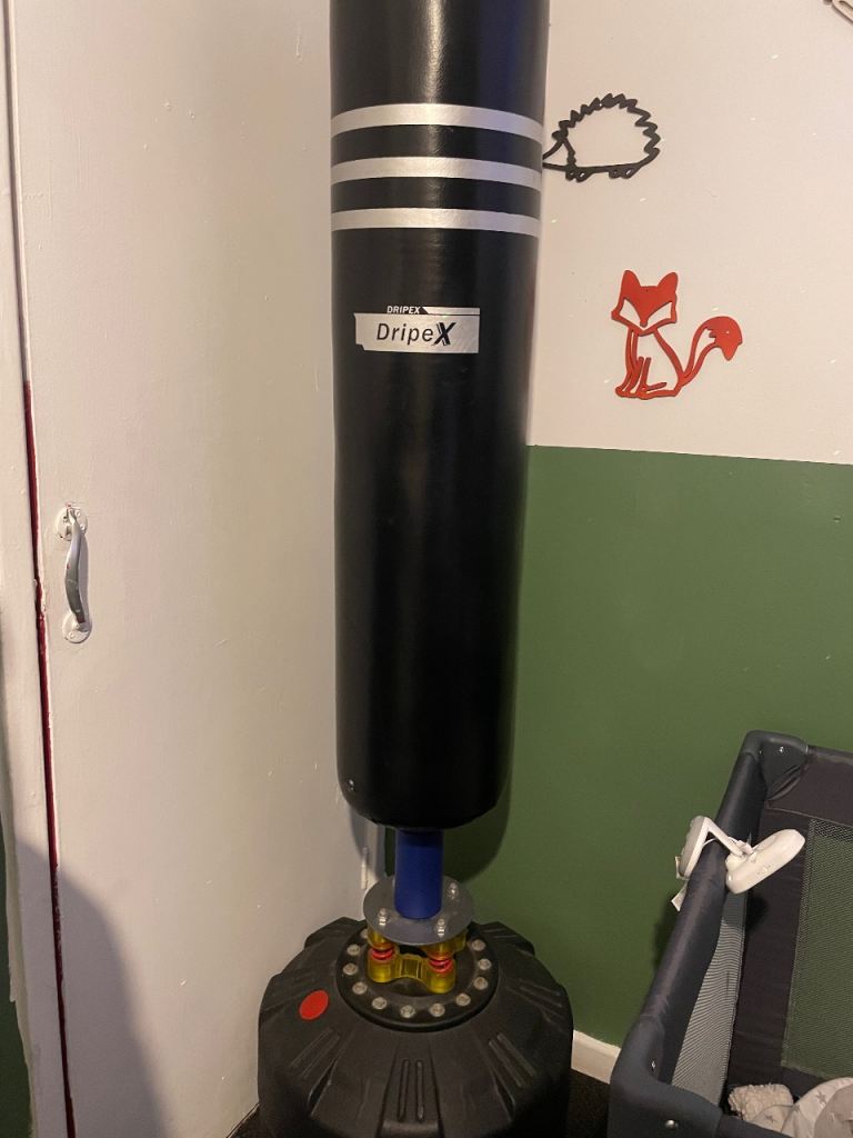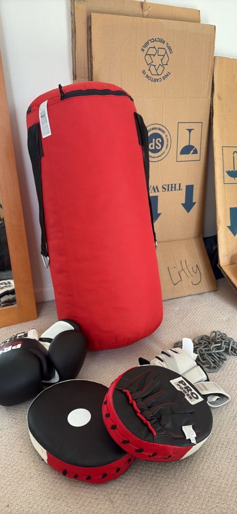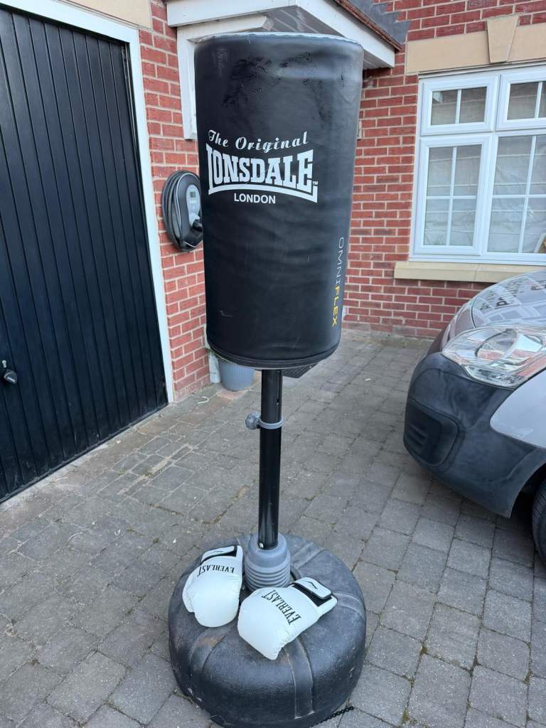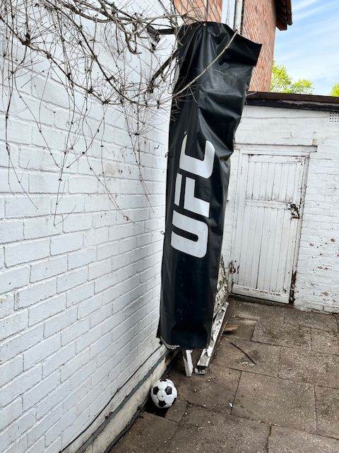 A heavy hanging 5 ft punch bag in reasonable condition with chain. bracket and cover. Some cosmetic wear and tear does not affest use of the item in any way. Collection only. Brackets just requires unbolting from the wall.