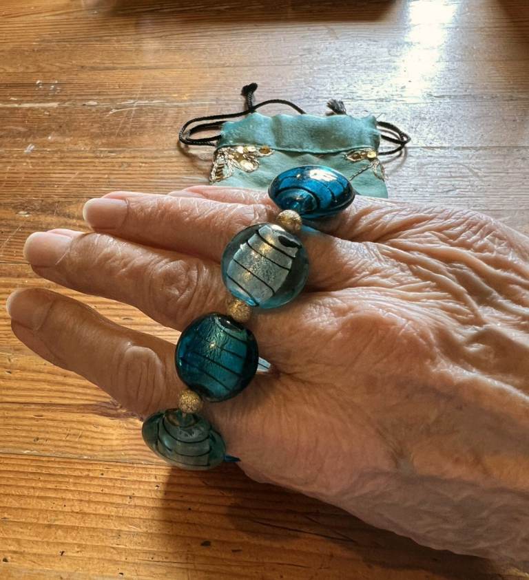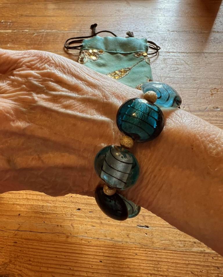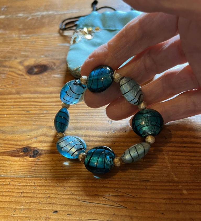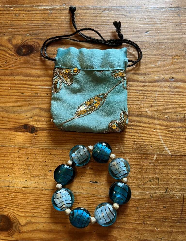 Light and Dark Blue Stones set in an elasticated band with small gold coloured beads in between the stones. Has only been worn a few times and is in excellent condition as can be seen in the photos.