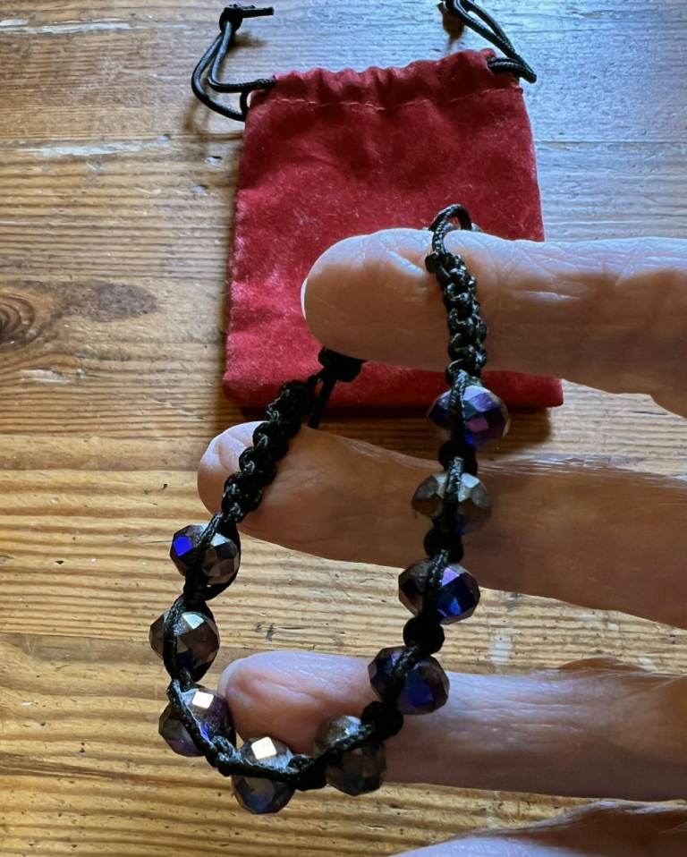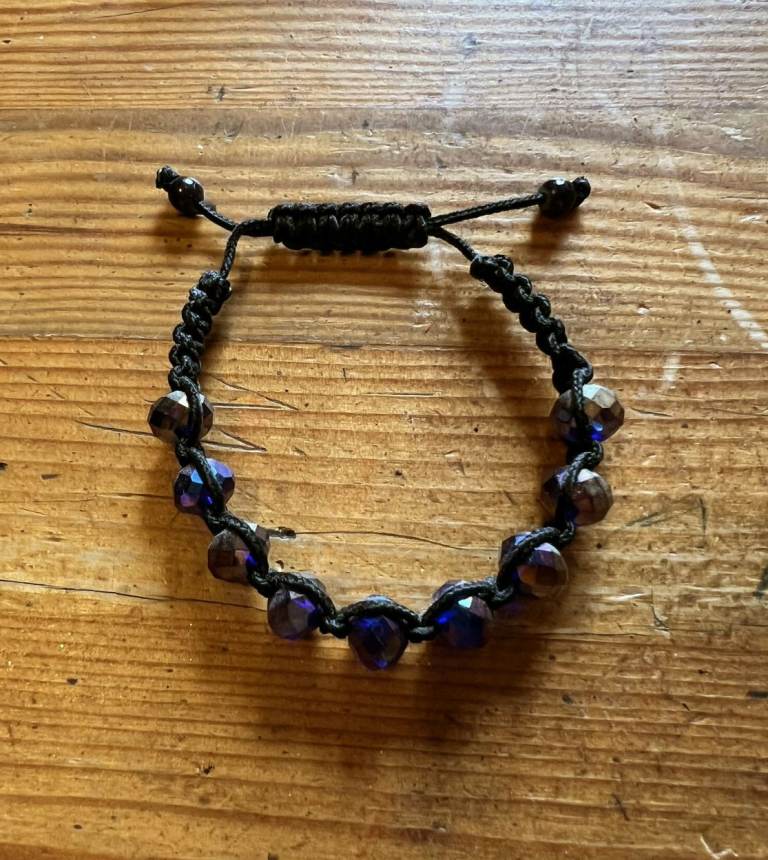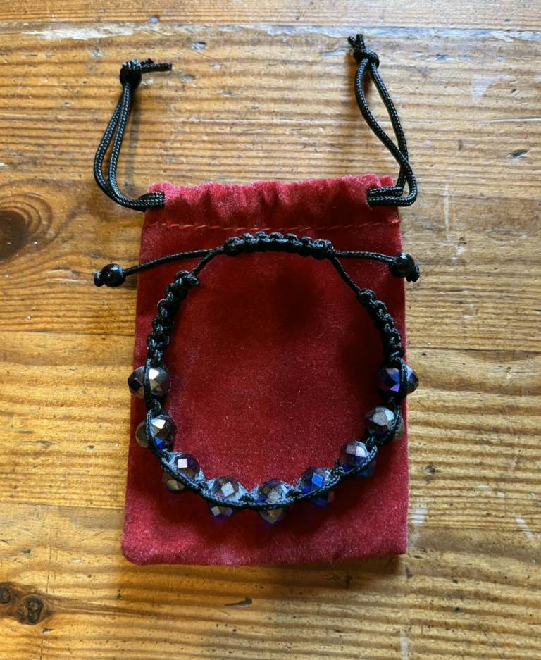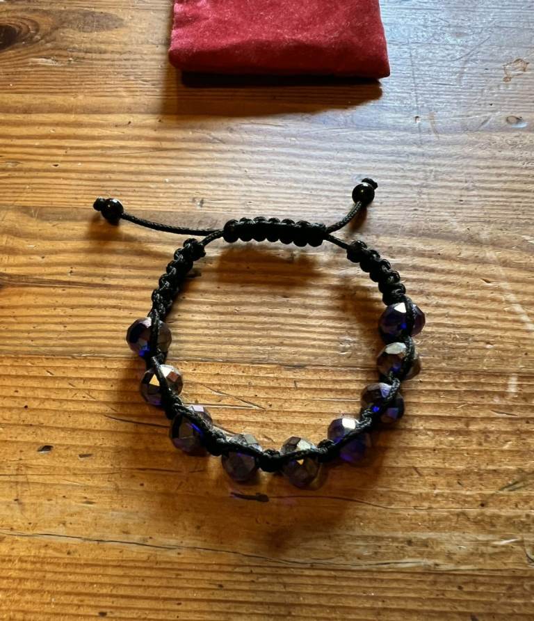 Black Cord Bracelet set half the way round with dark but sparkly stones and pull cord opening with small black beads on the end. Has only been worn a few times and is in good condition as can be seen in the photos. (The cord is a bit stiff when closing and opening)