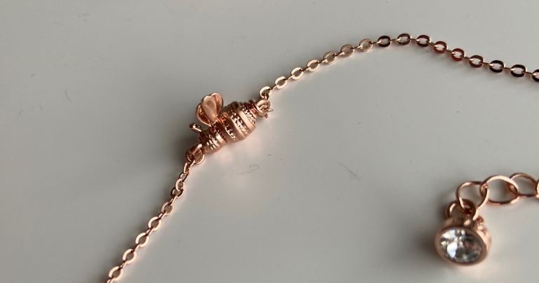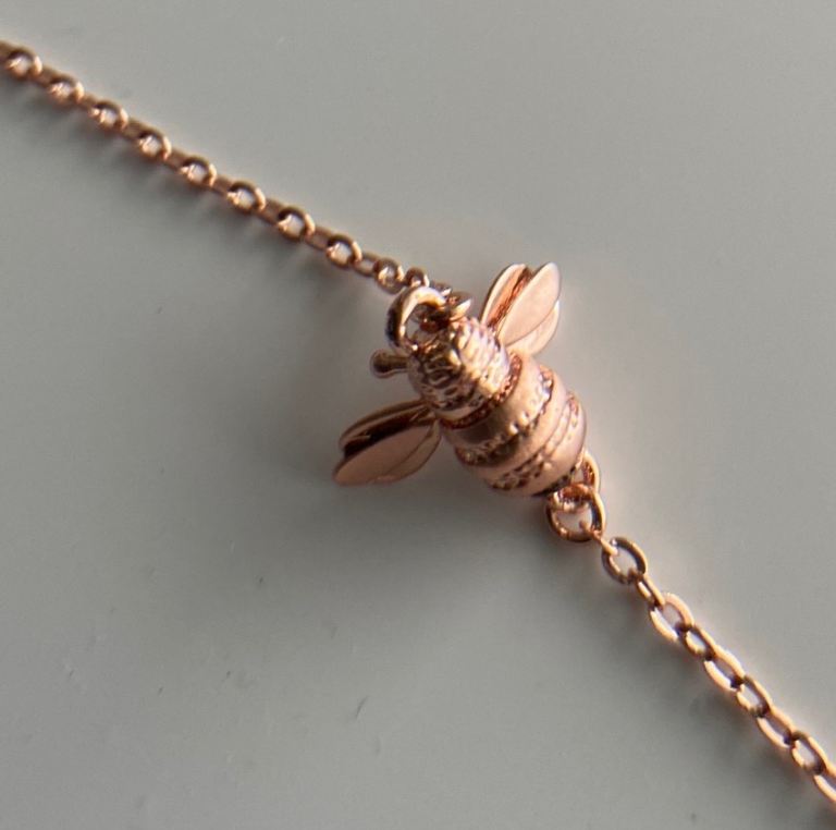 Rose gold tone metal and bee motif (approximately 1cm long).