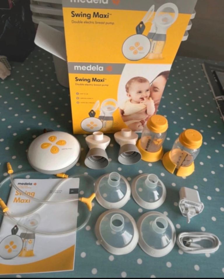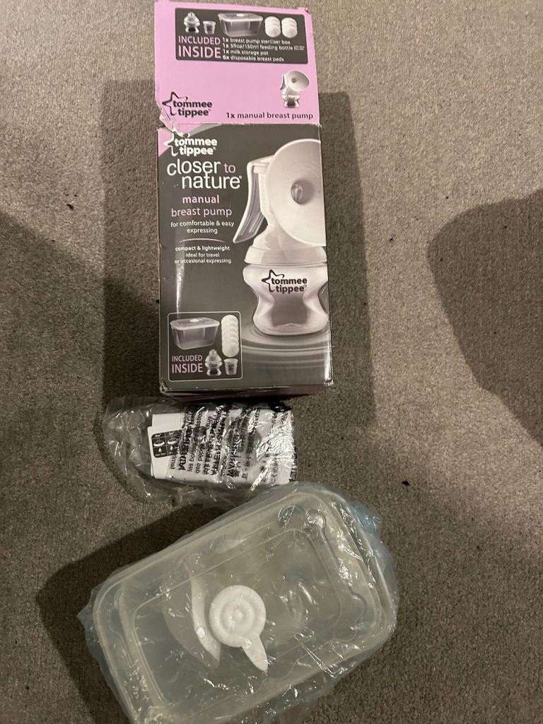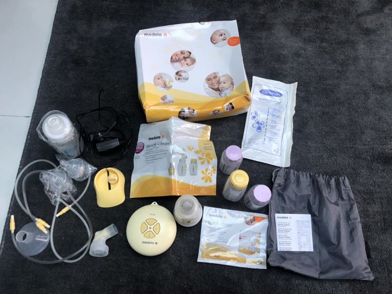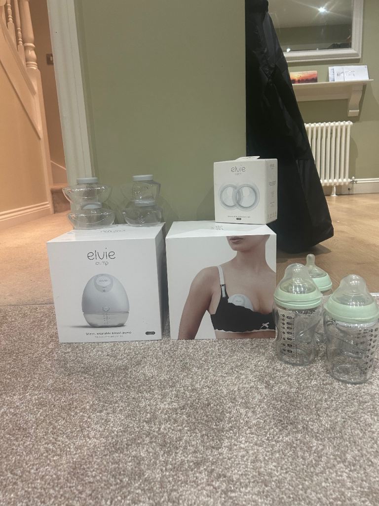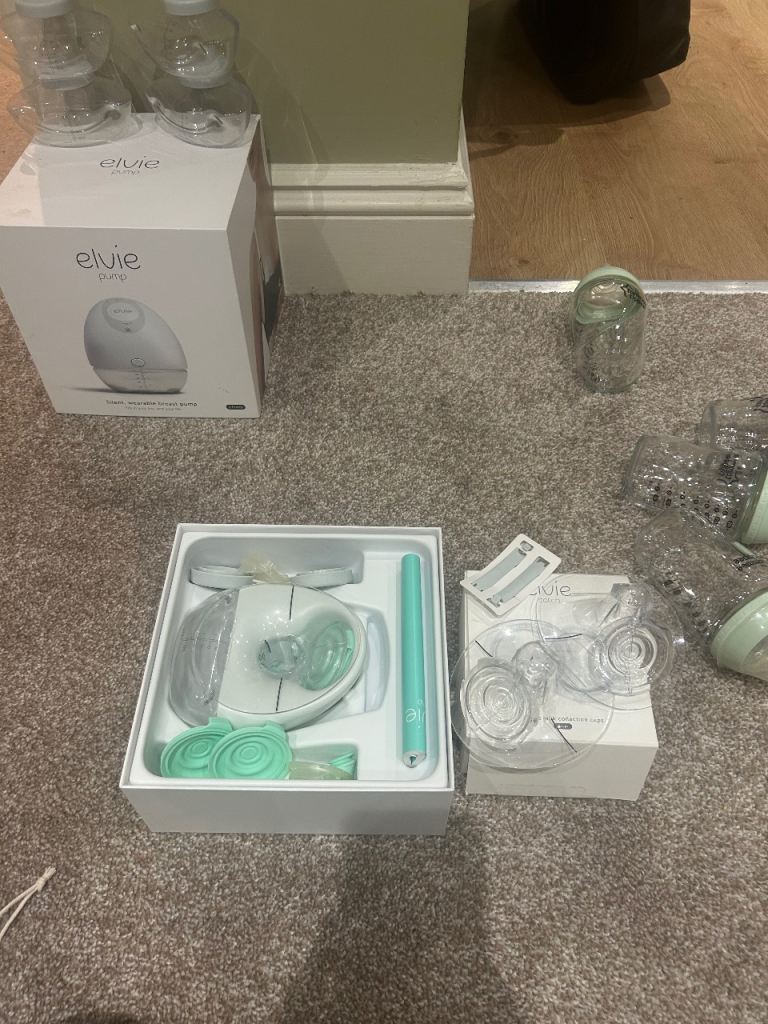 Selling two Elvie breast pumps, comes with boxes, accessories, spare bottles, milk catchers, instructions, charger