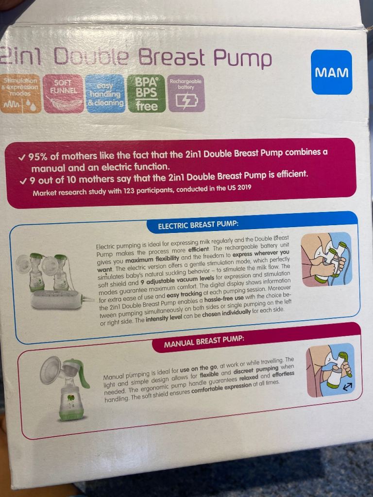 Double electric breast pump with also a manual hand pump. Used very lightly. All parts are cleaned. Some parts not used at all. Collection from Portishead.