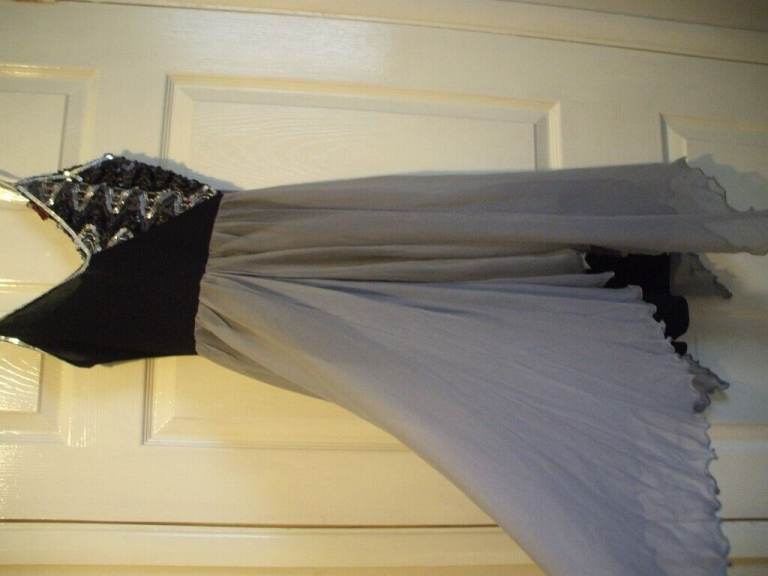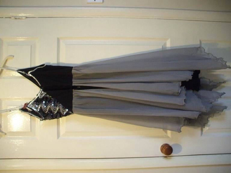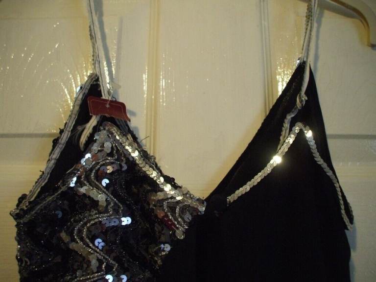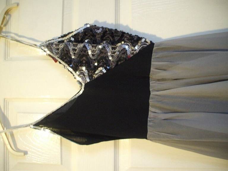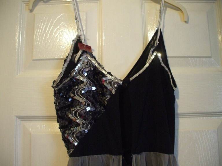 CHANTILLY BLACK/GREY/SEQUIN PRETTY PARTY DRESS WITH THIN STRAPS. NEW. SIZE 10. MADE IN ENGLAND DRY CLEAN DUE TO SEQUINS. 71% ACRYLIC 29 % NYLON. BOUGHT AND NEVER WORN -LABEL ATTACHED. PERFECT PRINCESS PARTY DRESS. GREY IS FLOATY FABRIC SIMILAR FEEL TO CHIFFON. HANDKERCHIEF HEM. BACK ZIP AND BUTTONS FASTENINGS. SEQUIN STRAPS NEED TO BE SECUREDTO REQUIRED LENGTH. WAIST TO HEM OF MAIN BLACK DRESS 62 CMS- GREY IS LONGER DUE TO HANDKERCHIEF. BODICE TOP OF 'POINT' TO WAIST 22 CMS. I DOUBT YOULL FIND ANOTHER LIKE THIS ON LINE AS IT HAS BEEN PACKED AWAY SINCE THE EARLY 90S. IDEAL PROM DRESS PERHAPS