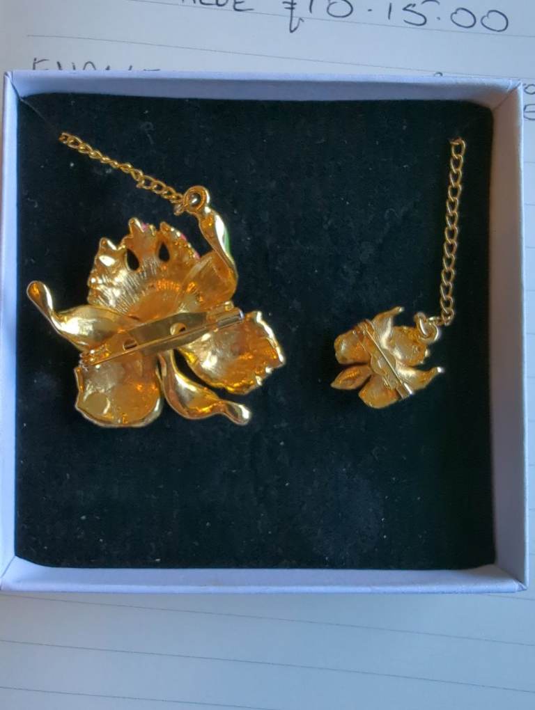 Hibiscus enamel two flower brooch with delicate chain and rhinestone centres.No chips. Red, gold and green.