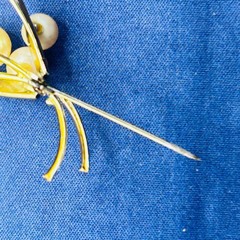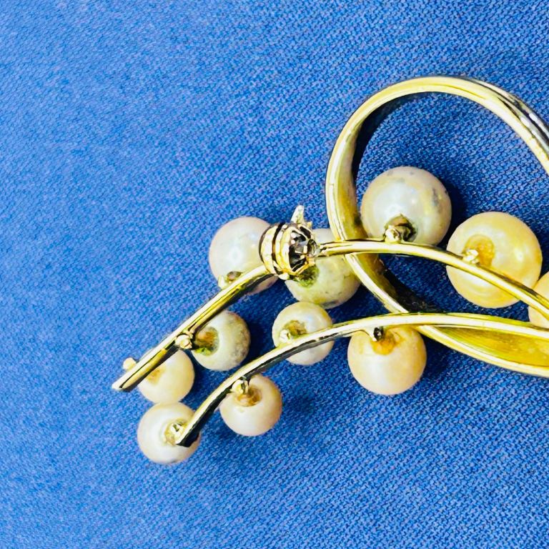 This elegant mid-century vintage botanical brooch is approx 55mm x 35mm & features a beautifully crafted gold‑tone spray design set with lustrous faux pearls in soft, natural tones. Its secure roll‑over safety clasp and immaculate condition make it a charming accessory for collectors or anyone who appreciates classic mid‑century style. The craftsmanship is refined, with individually mounted beads and a clean, well‑balanced frame. A timeless decorative piece that adds sophistication to jackets, scarves, hats, and special‑occasion outfits.