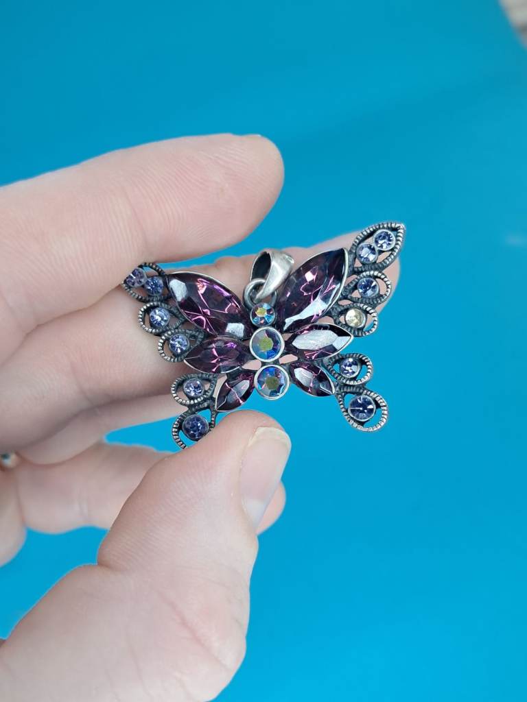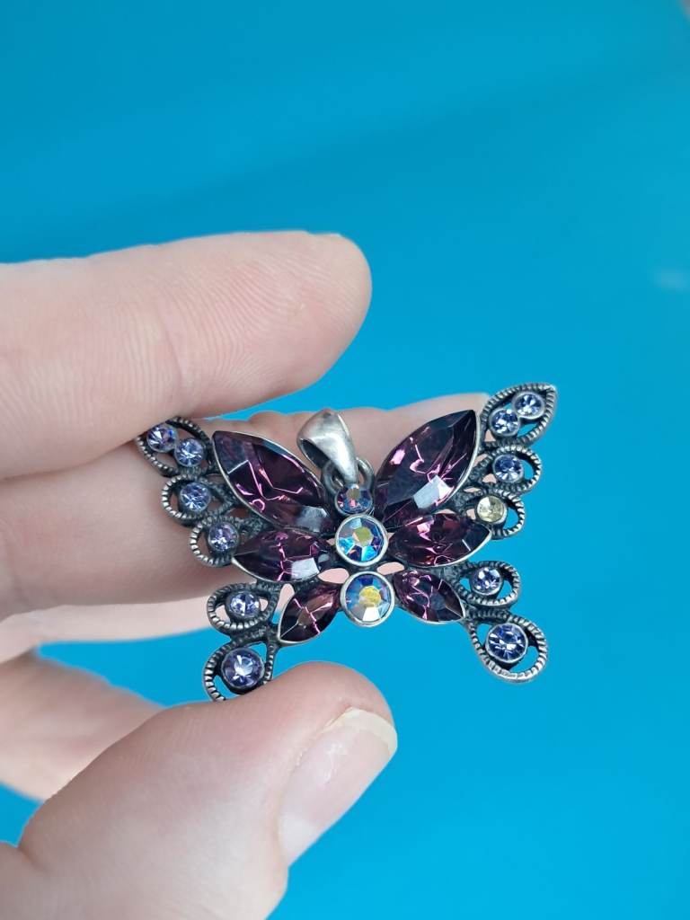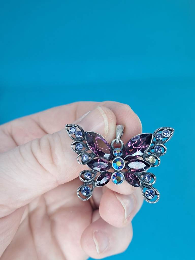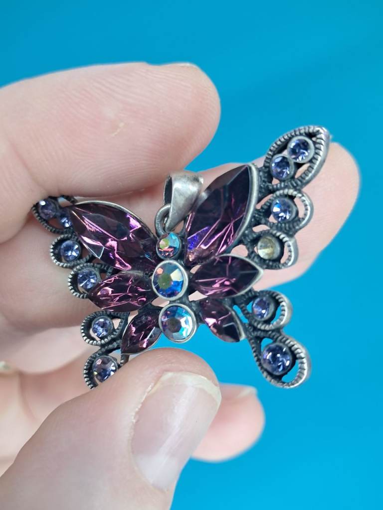 Vintage-style butterfly pendant with purple and iridescent crystal rhinestones and a metal alloy setting.