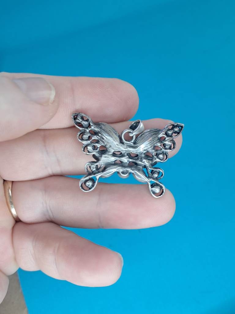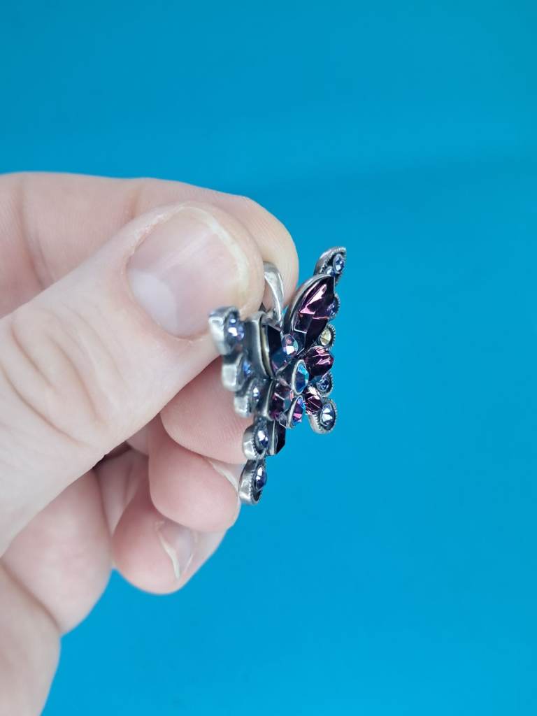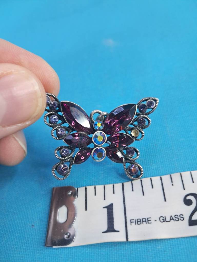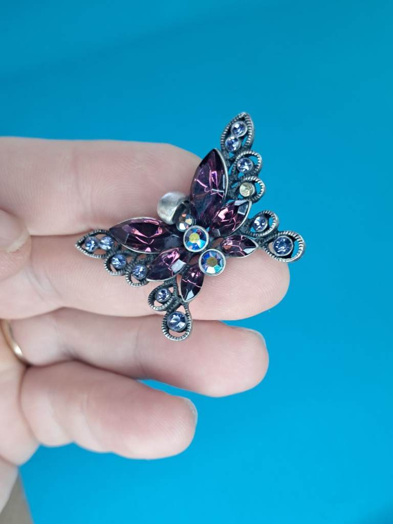 Vintage-style butterfly pendant with purple and iridescent crystal rhinestones and a metal alloy setting.