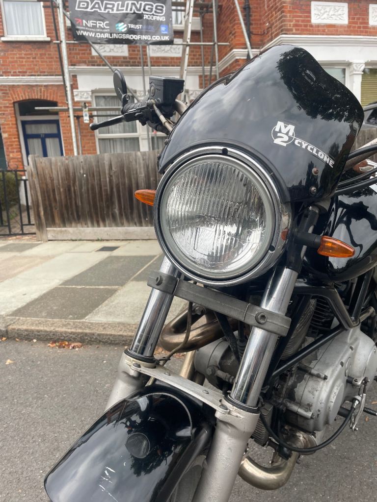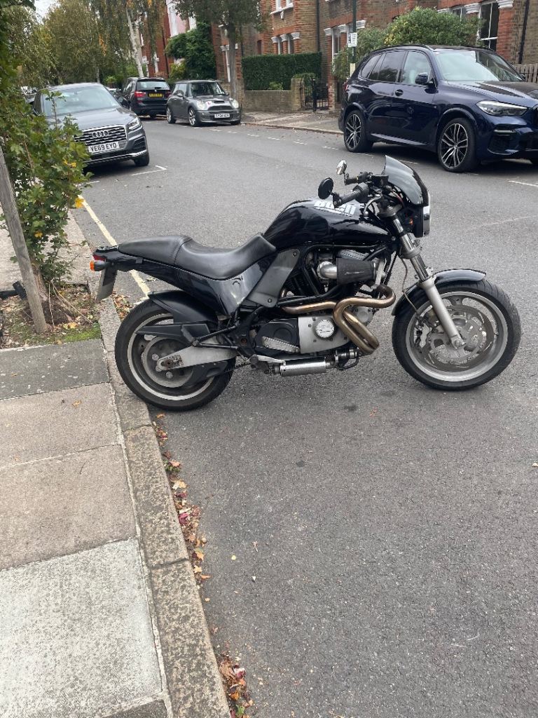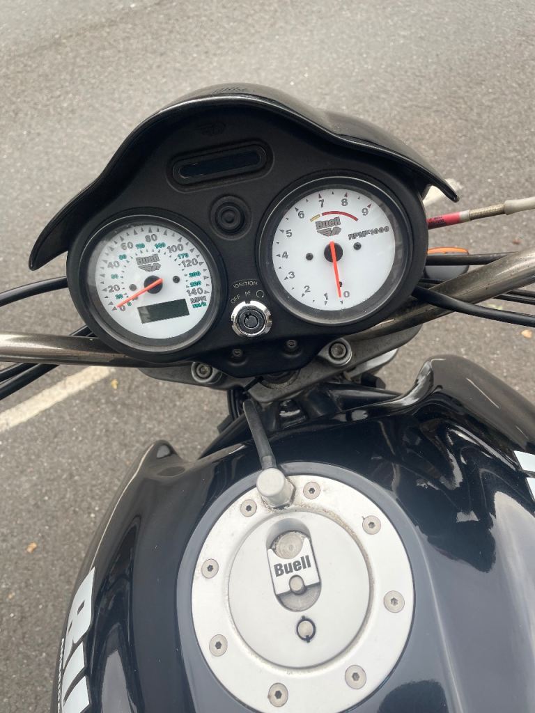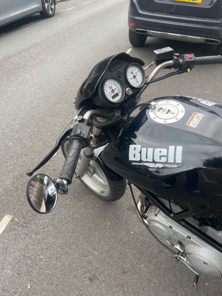 Buell M2 Cyclone. Last tubular model with carb. Spectacular torque and surprisingly agile. Totally standard but with re-welded aluminium White Brothers exhaust and braided front brake cable. Owned 7 years and over £2,000 spent (receipts) on upkeep with new internal gear selector and fourth cog/gear. Zero slippage. Will need new back tyre for next MOT. Mileage may increase as in use.