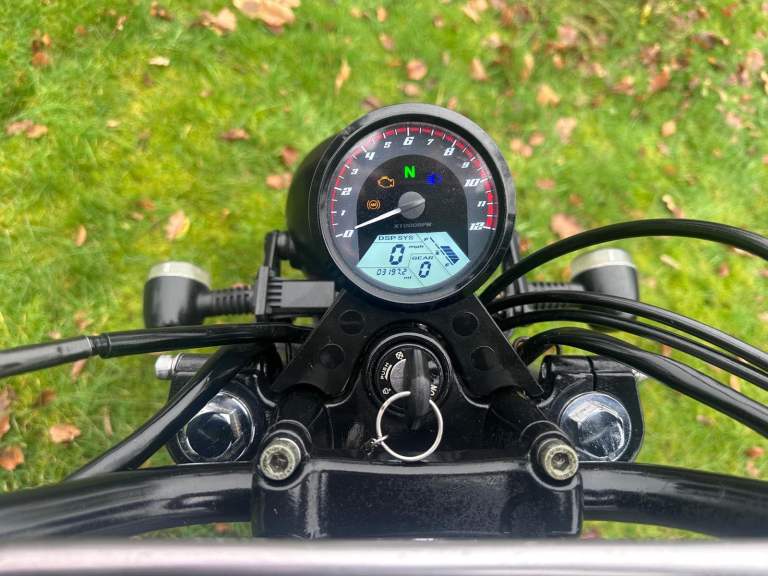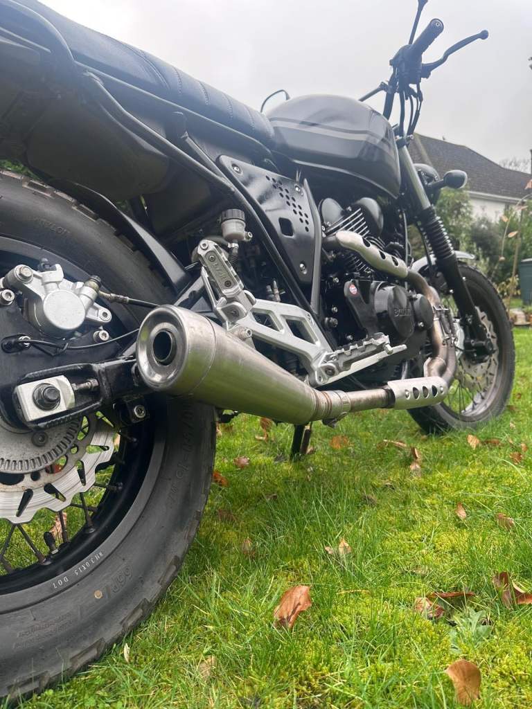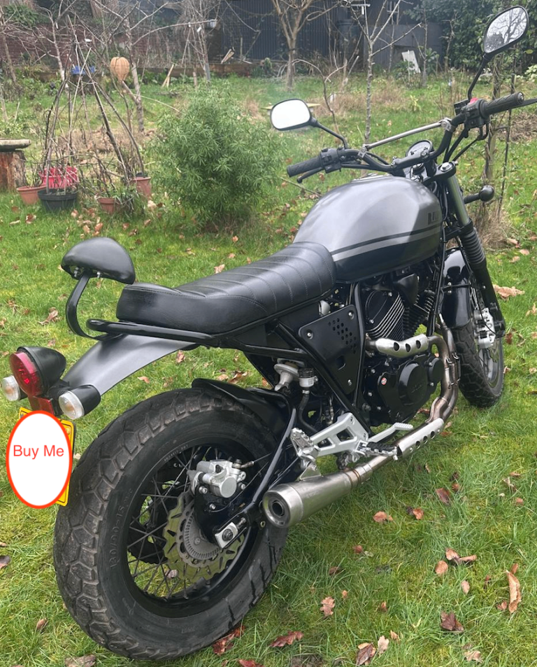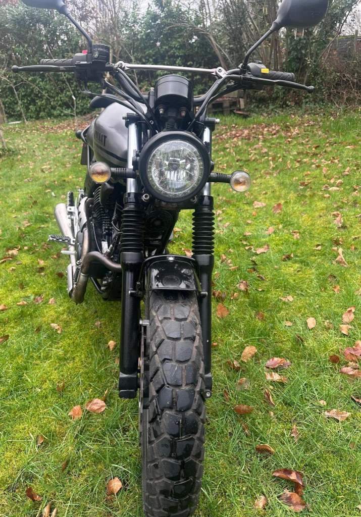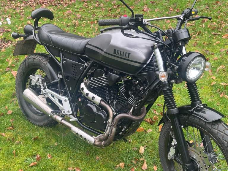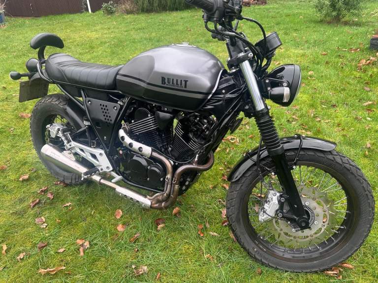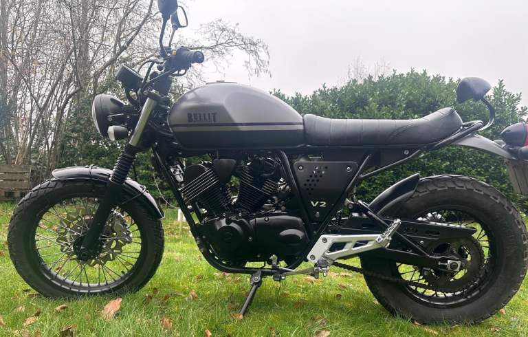 This Bullit Bluroc V Twin 250 has a classic retro scrambler look and is powered by a Yamaha based, air-cooled four-stroke 249cc engine.