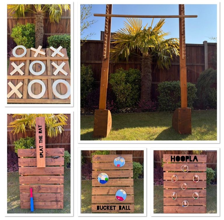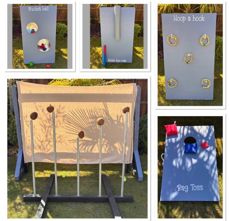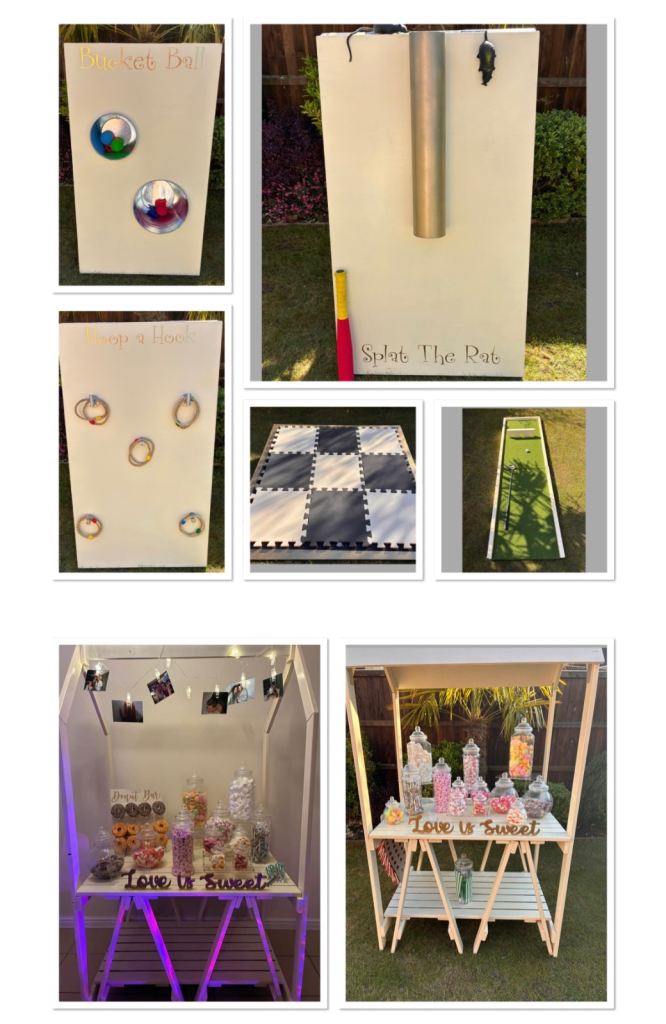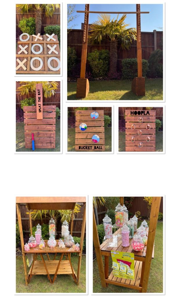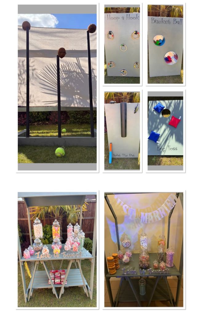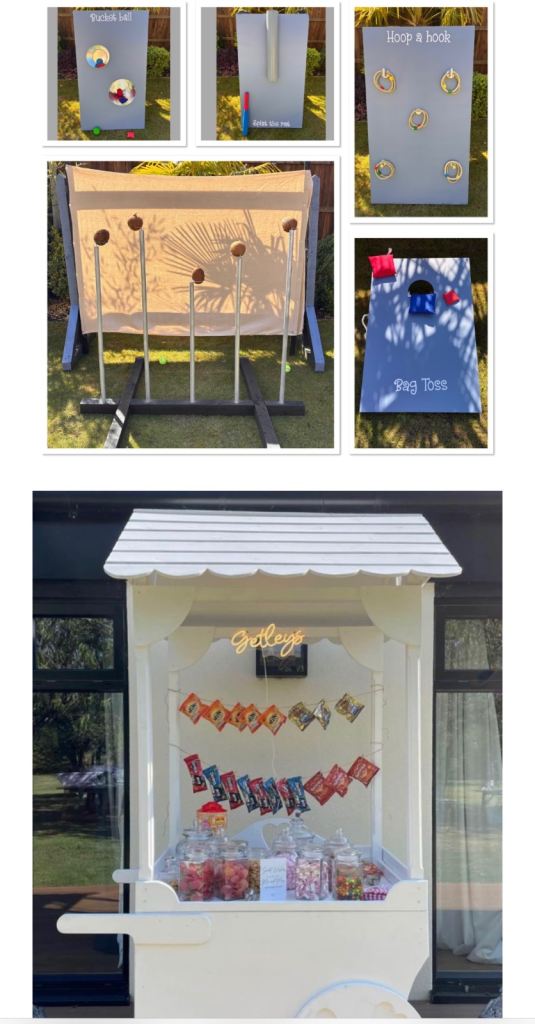 4 colour themes of wedding/garden games all with a matching sweet cart or table.