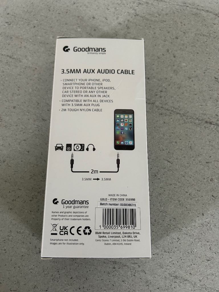 Brand new Goodmans 3.5mm AUX audio cable, still in its original packaging.