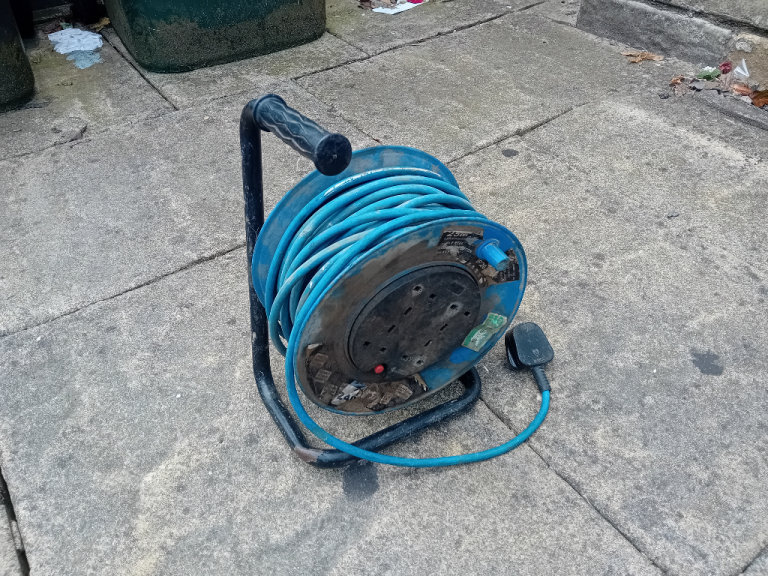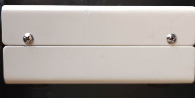 Off-white and has a few superficial scuffs and scratches but is very solid, made of 2mm thick steel and weighs around 1.5kg.