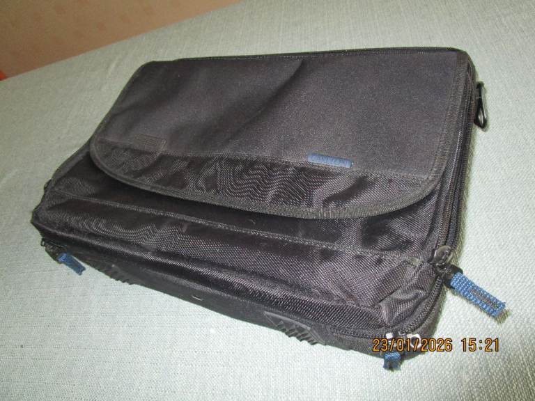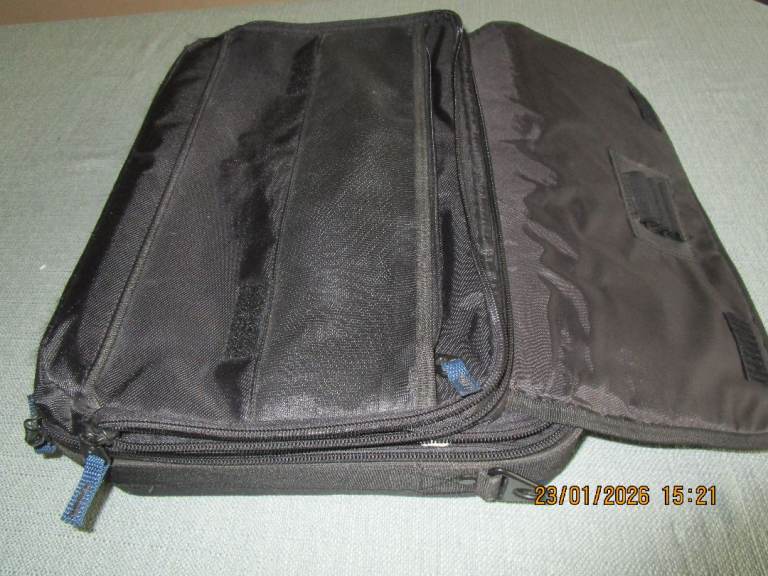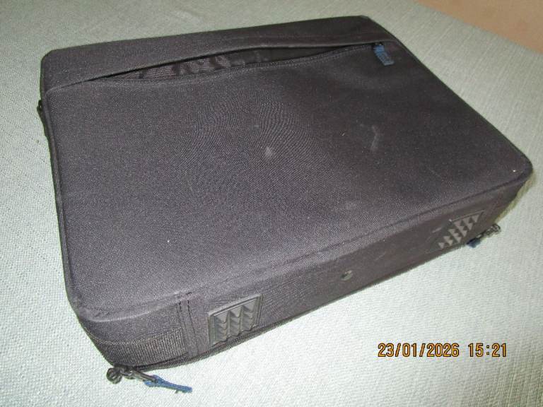This bag is black and is in superb condition and is 30 x 40 x 10 mm with 3 main compartments and has many pockets and clips inside. It has Padding in one internal section for a Laptop. It has a carrying hand grip. and has clips for a shoulder strap but it is not suitable for wearing on one's back. It was bought for project that did not start and was never used. This case is available for collection from Purley, Surrey South London