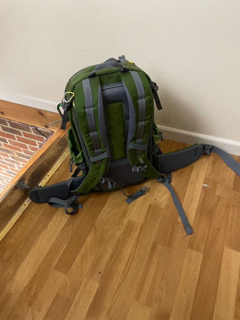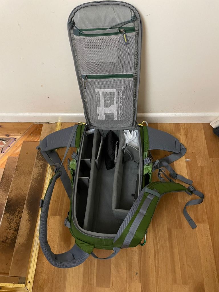 Backpack in Montane Green with padded straps. Multiple, adjustable compartments with a rain cover and side tripod attachments.