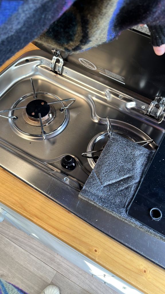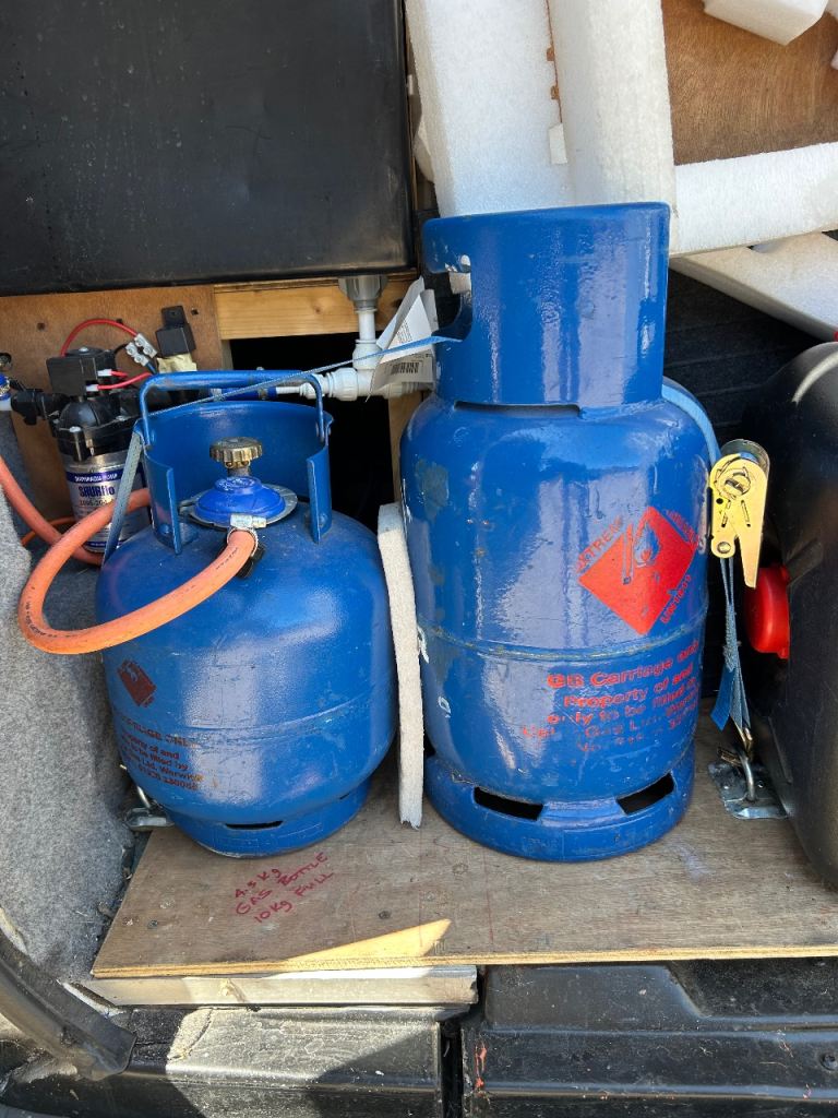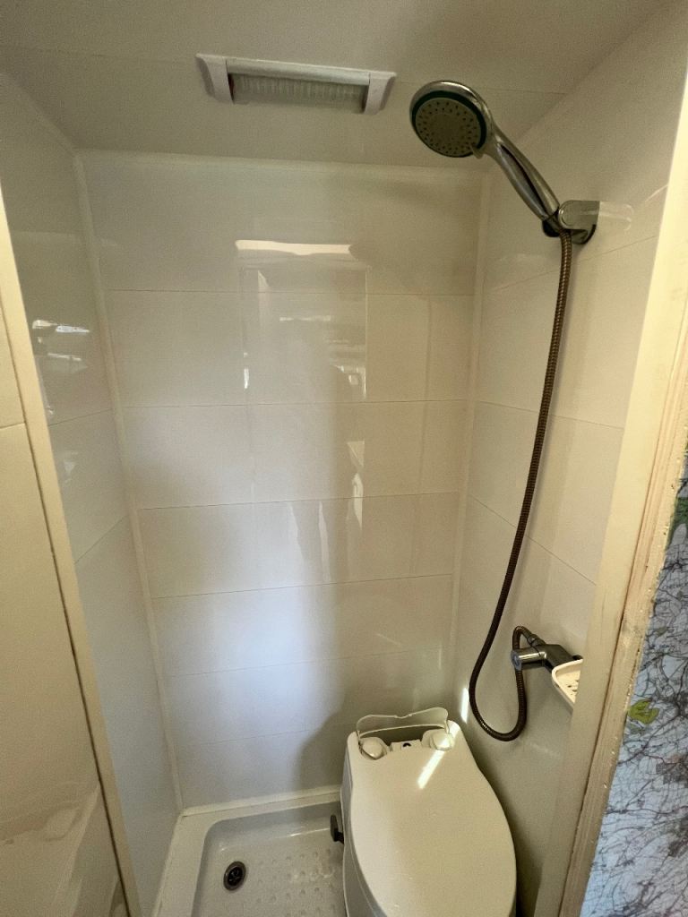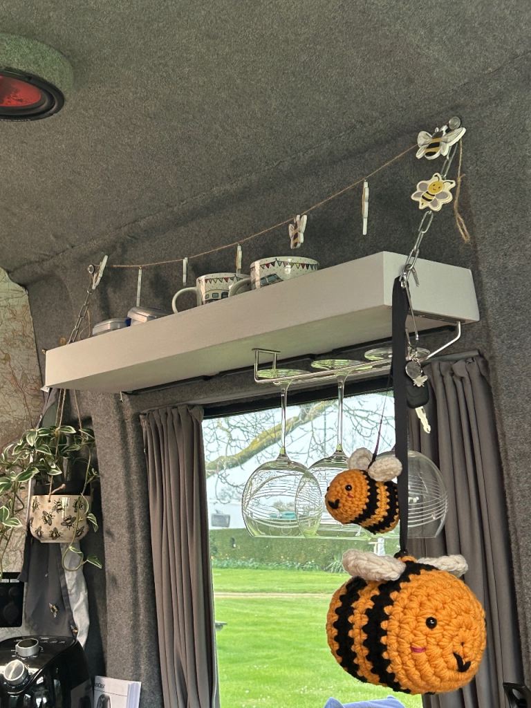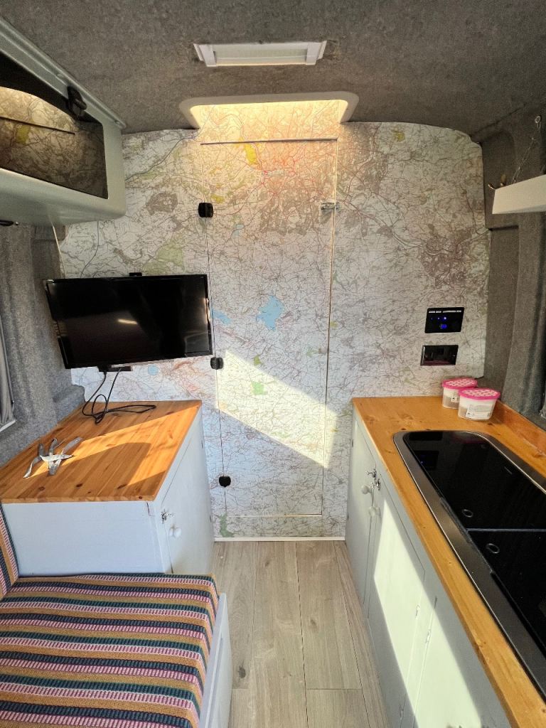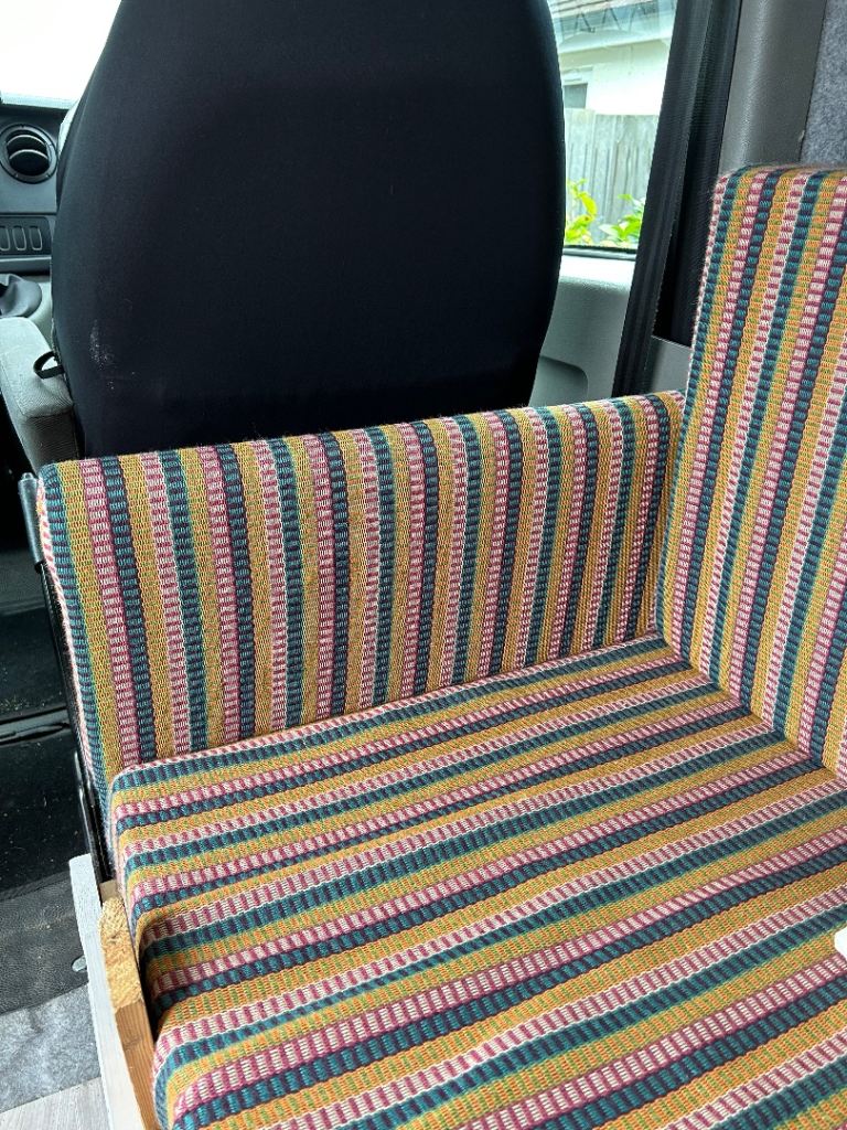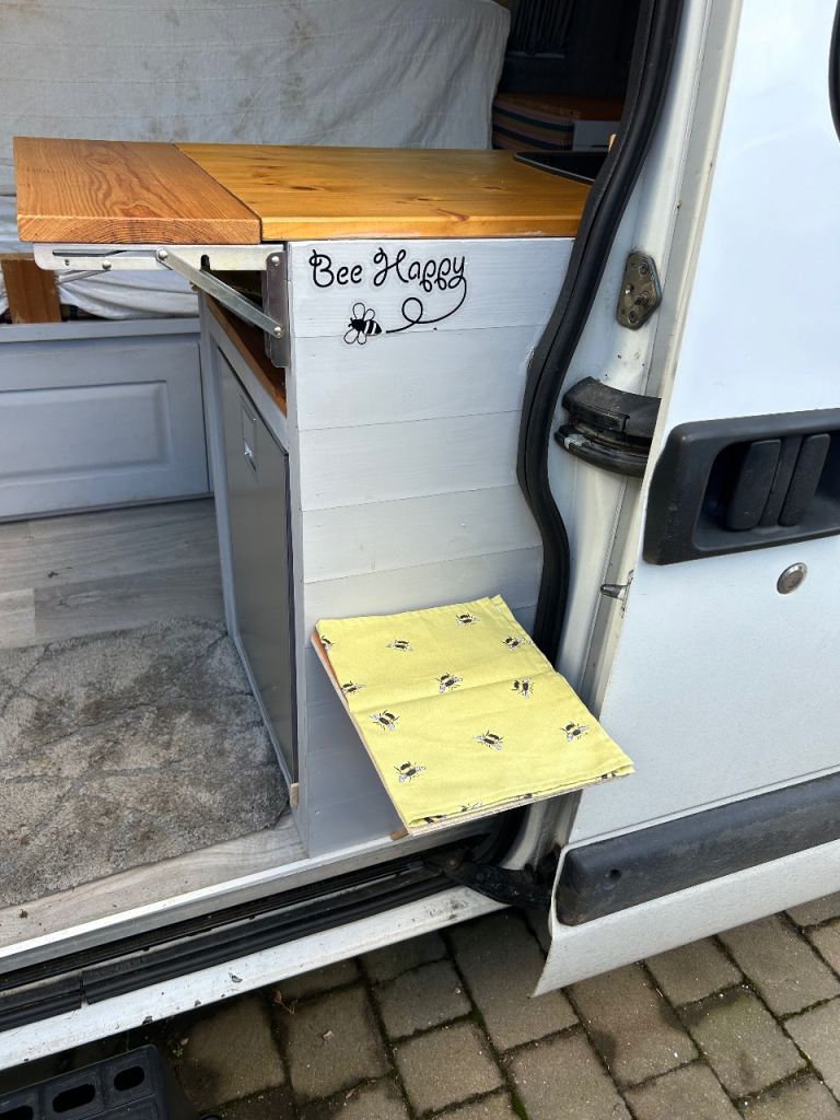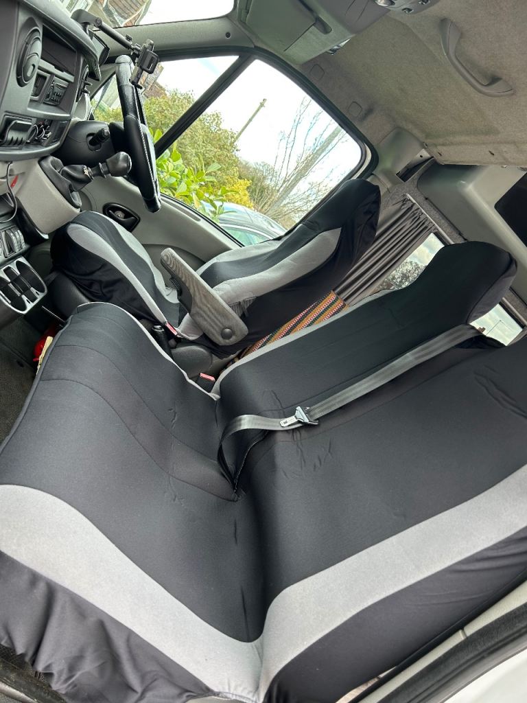 Three front seats, bench seat that pulls out to make a full size double bed, two burner gas hobb, fridge with freezer compartment, sink, shower, water tank, and storage area at the back, mains hook up, two leisure batteries, bottled gas, 12v/240v inverter, solar panels on the roof.