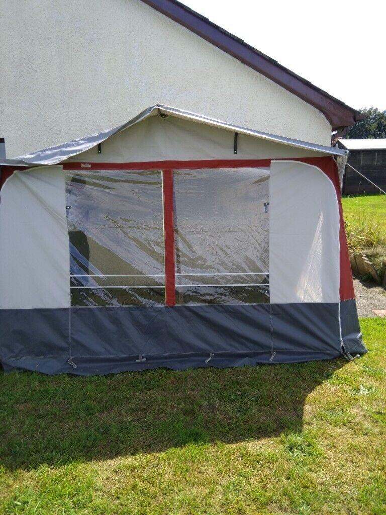 Sizes are: 80" (2m'trs) depth of roof from caravan to front edge. 130" (3m'trs) length which threads into channel on caravan roof edge. 67" (1.7m' trs) front height. Plus skirt depth 1' (300mm) all approx.