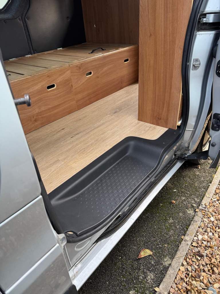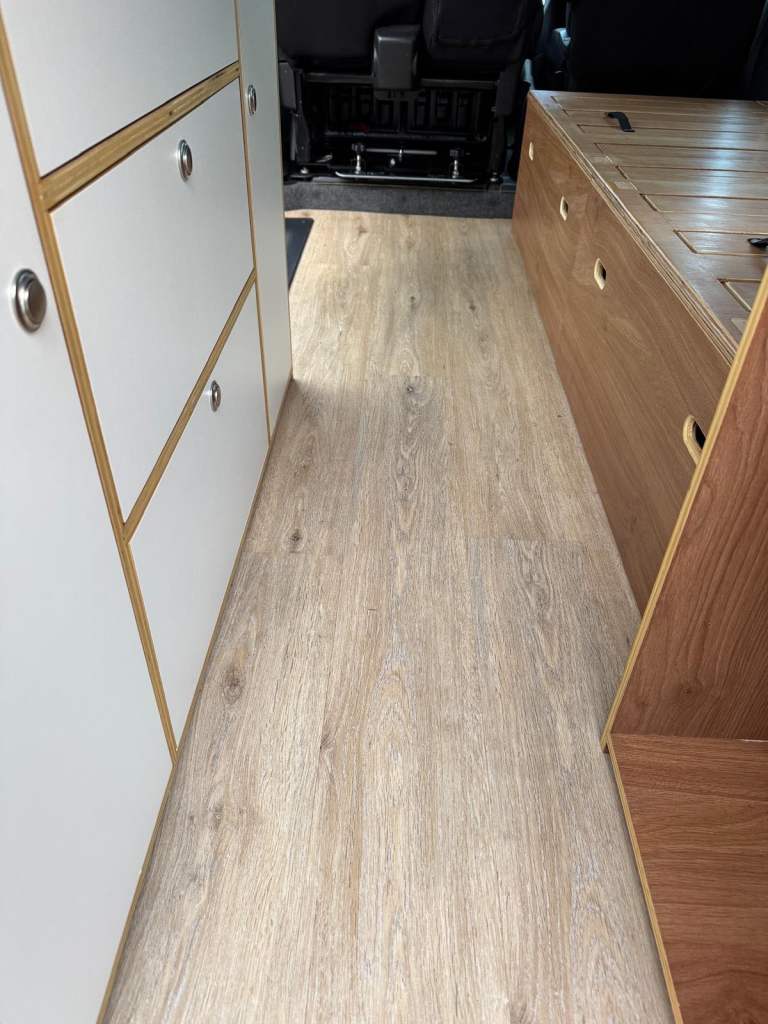 - flooring click-lock (Luxury Vinyl Tile) LVT floor and under insulation, Renault Trafic side step and metal rear finishing cover.