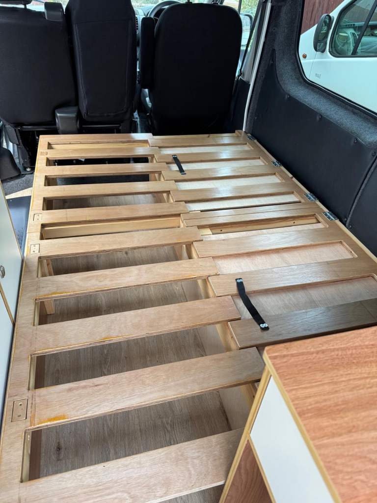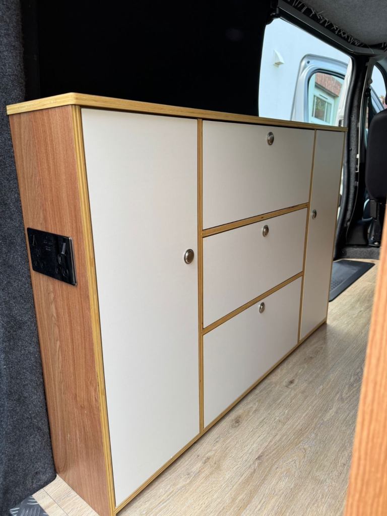Campervan Conversion Storage cabinet, Kitchen Pod/Unit, and sliding pull out bed Custom made with Vohringer Laminated lightweight 15mm furniture Ply, High quality birch ply in mid oak and cream, very strong and tough.