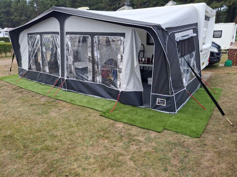 Size 15, steel adjustable pole awning, width 2.4 metres. Comes with two extra roof poles, clips and Veranda wind lock 2 pole system. Also comes with green mesh rubber ground mats and grey/blue carpet. Great condition, only used 7/8 times. Cash on collection.