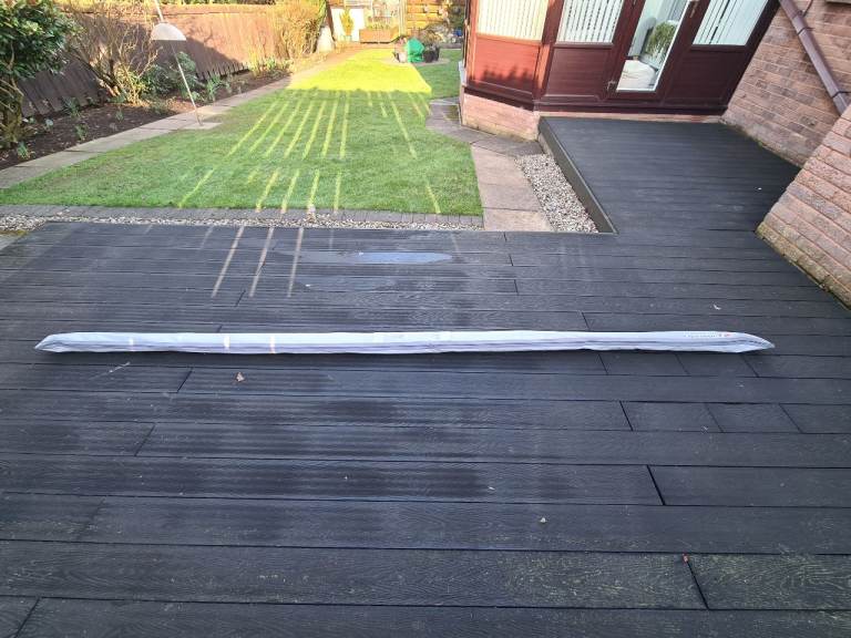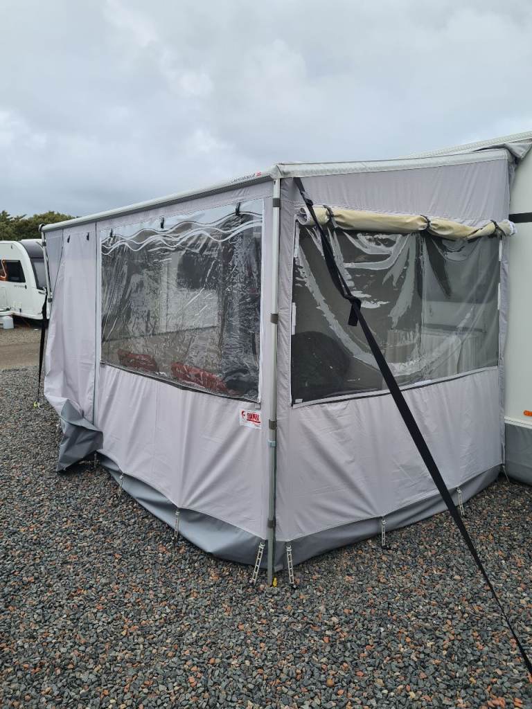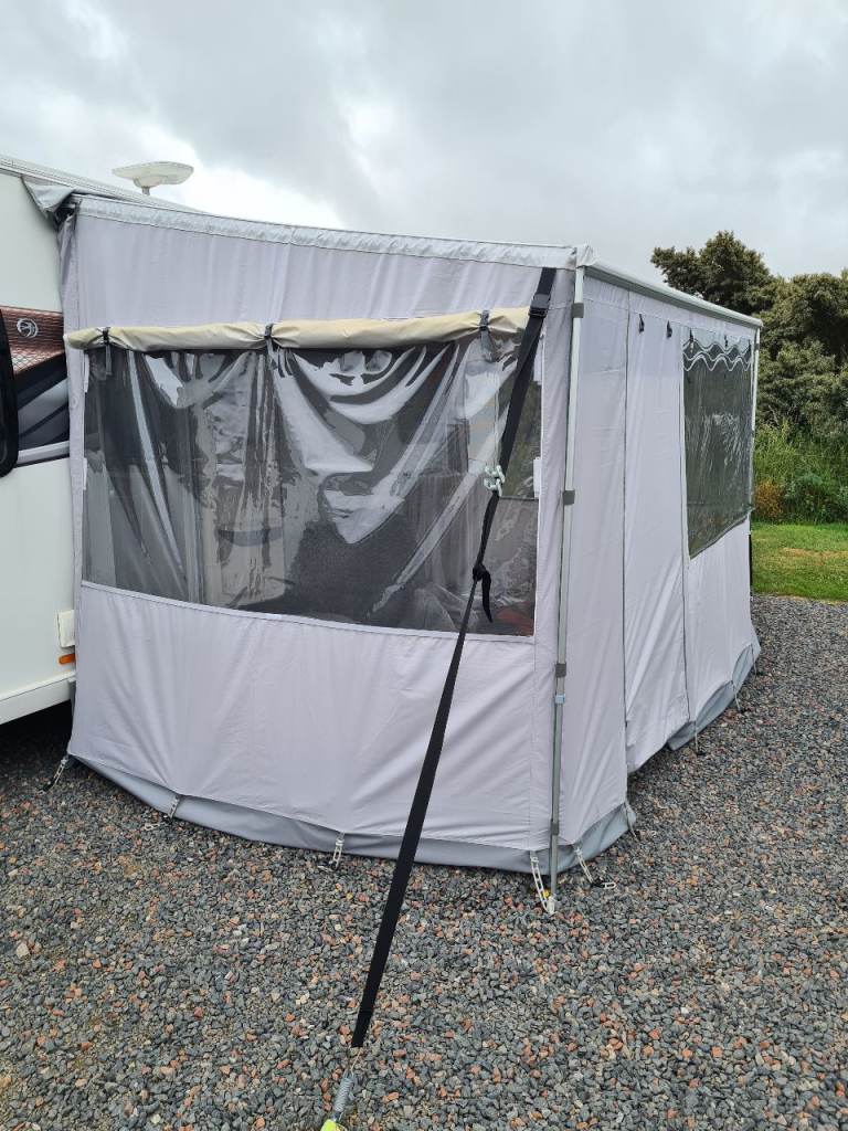 Fiamma Caravanstore roll out awning with Privacy Room. Total length of awning bead approx 3.65m. Total length of canopy approx 3.33m. Depth of Privacy Room approx 2.1m