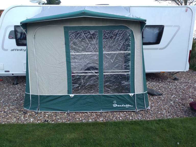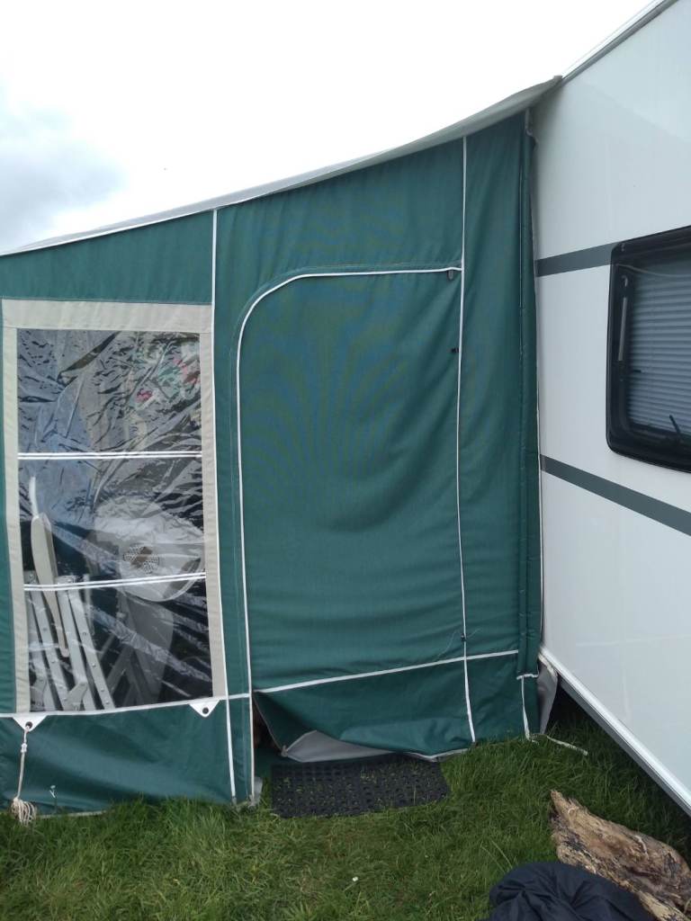 Green and cream, porch awning, good condition, complete with 2 sets of poles, ( including storm poles) and curtains.