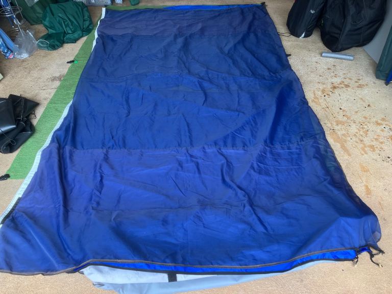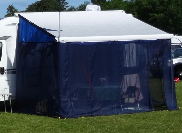 Full set of bespoke panels in blue netting with blue membranes in each panel. Made to measure for Auto-sleeper Broadway EB but will fit other motorhomes of similar size with fitted with Thule. Fiamma or similar wind out awnings. (See dimensions below and illustrated in the attached diagram.