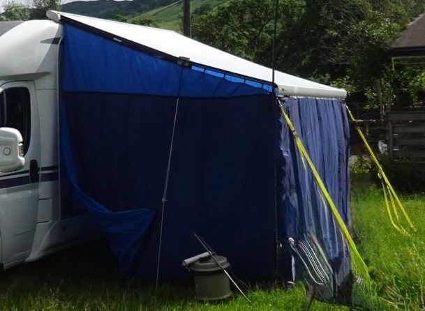 Side panel are hung from spring loaded poles which fit between the awning mount on the side of the motorhome and the extended awning rafter.