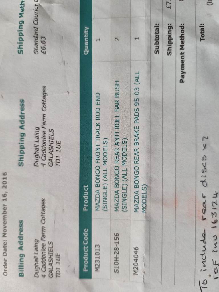 Brand new pair of rear brake disks, rear bushes and a track rod end. Insulated window screening and instructions manual.