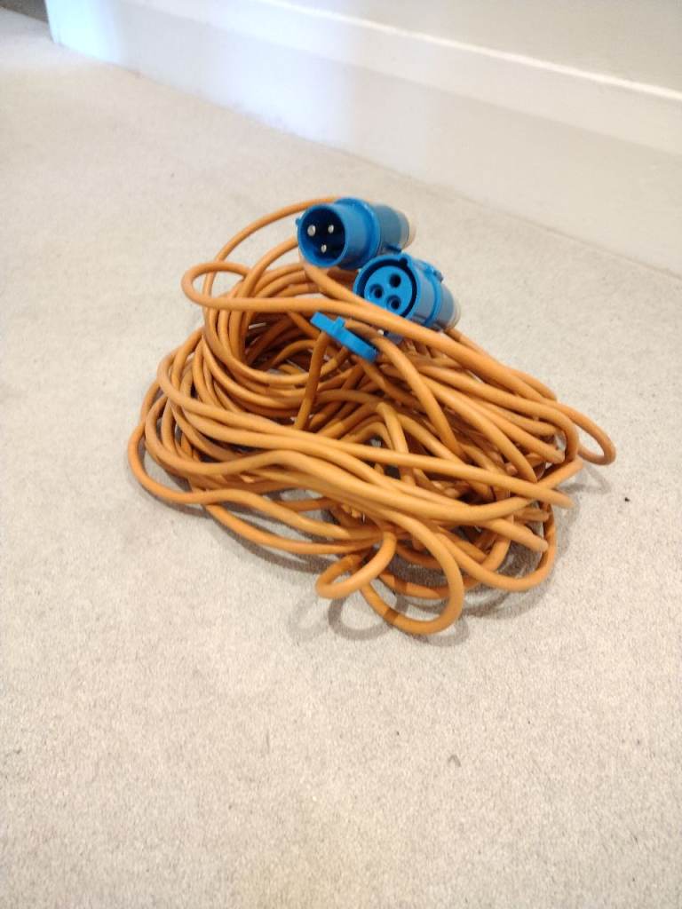 25 metre electric hook up lead fitted with standard 16 Amp connectors for connection to campsite power supply
